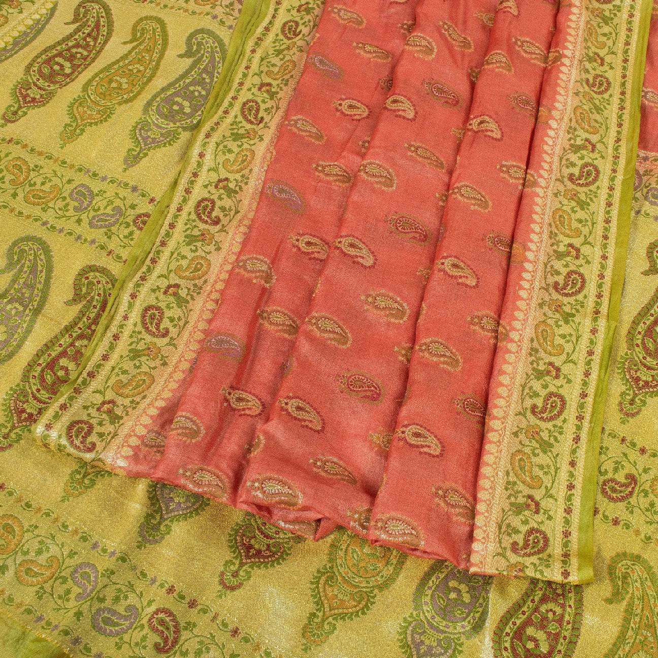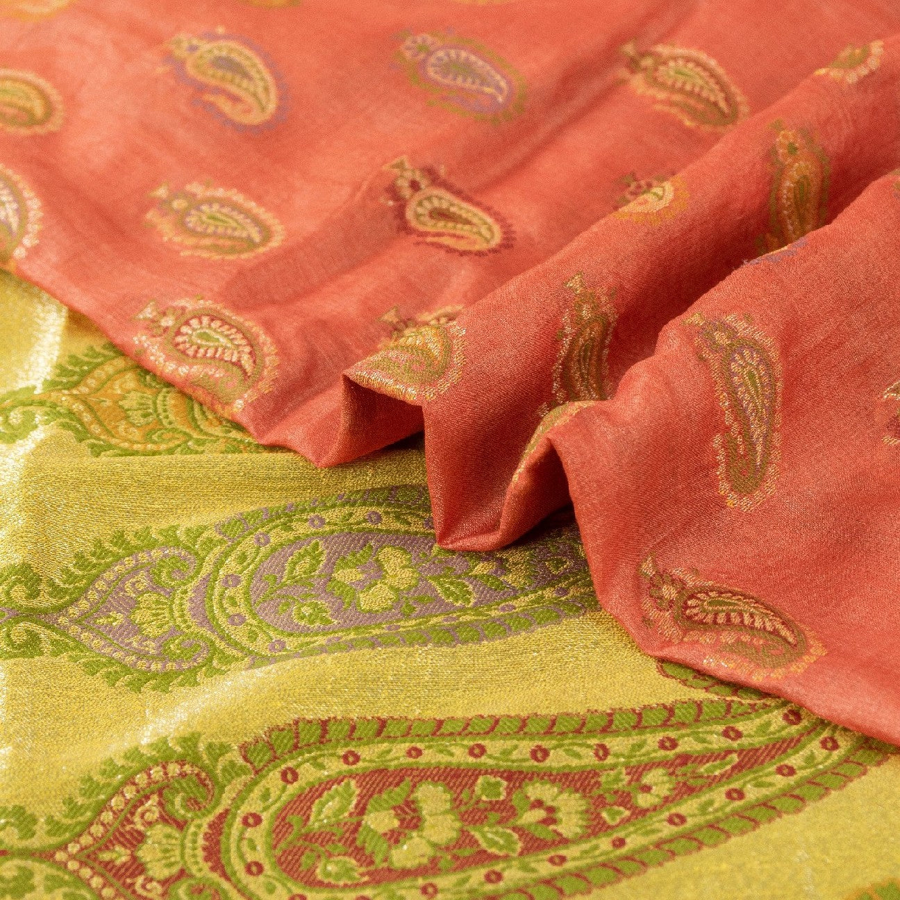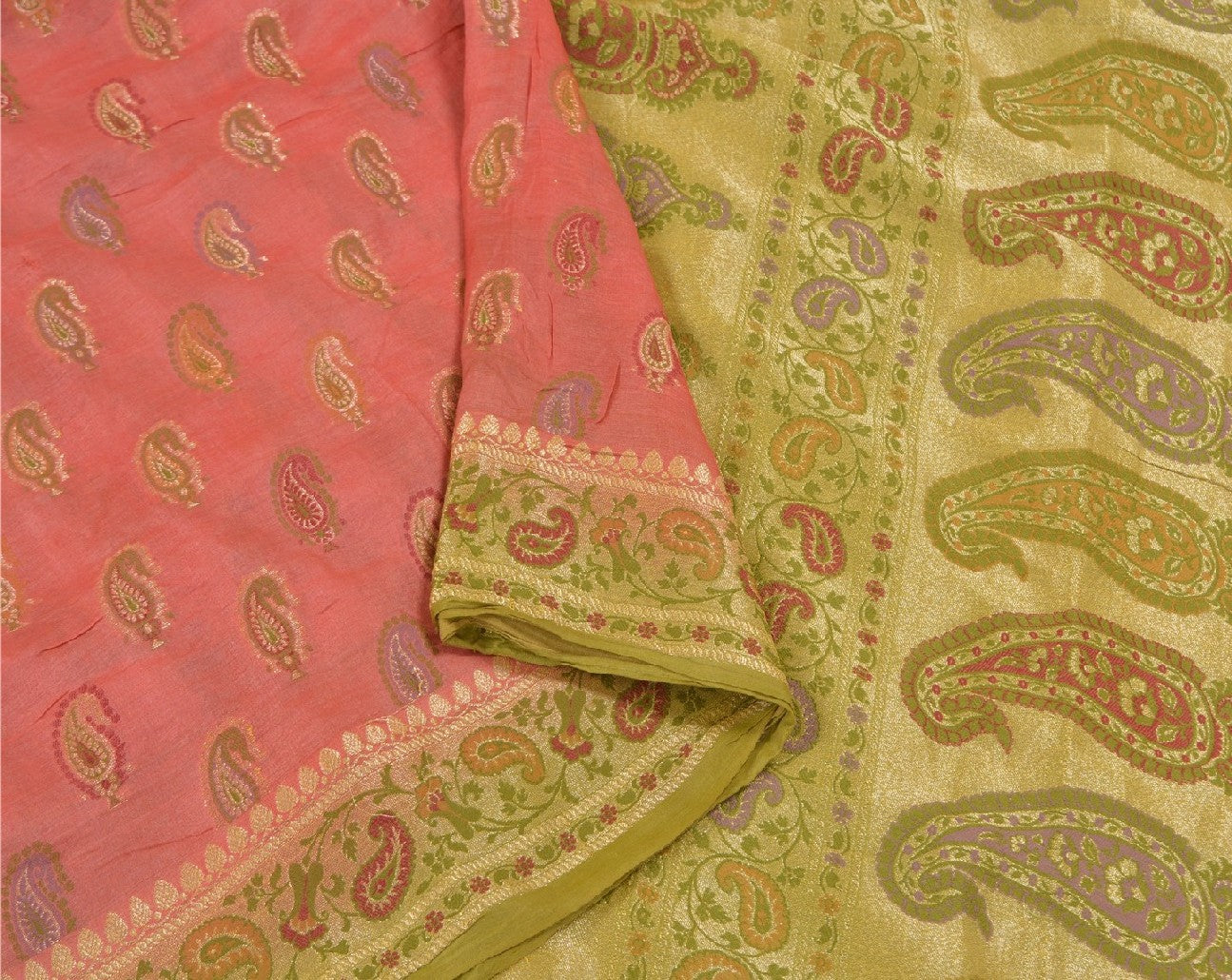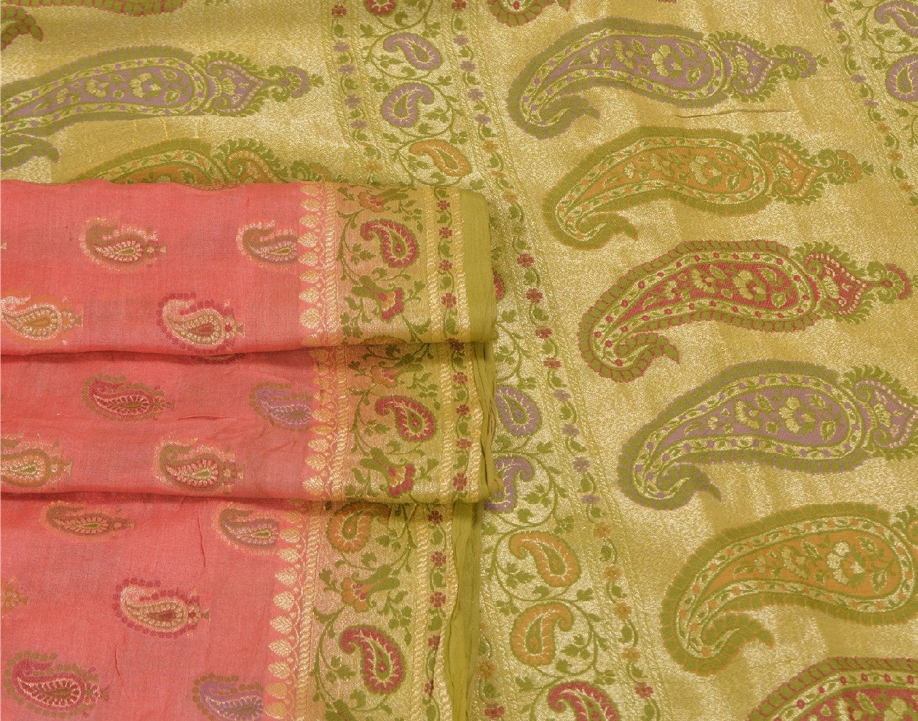 Сари ручной работы из 100% чистого шелка красивого персикового и зеленого оттенков. Pallu & Border изготавливает изделия из разноцветных нитей вручную с цветочным и пейсли-узором. Центр сари имеет аналогичный тканый цветочный и пейсли-узор. Это сари можно использовать и для различных идей рукоделия. Используйте его для дизайна одежды, в качестве пледа, для оформления окон, обивки, столового белья и многого другого. Дайте волю своим творческим сокам. Для покупателей из США — один товар отправляется заказной авиапочтой, при покупке еще одного товара — FedEx.