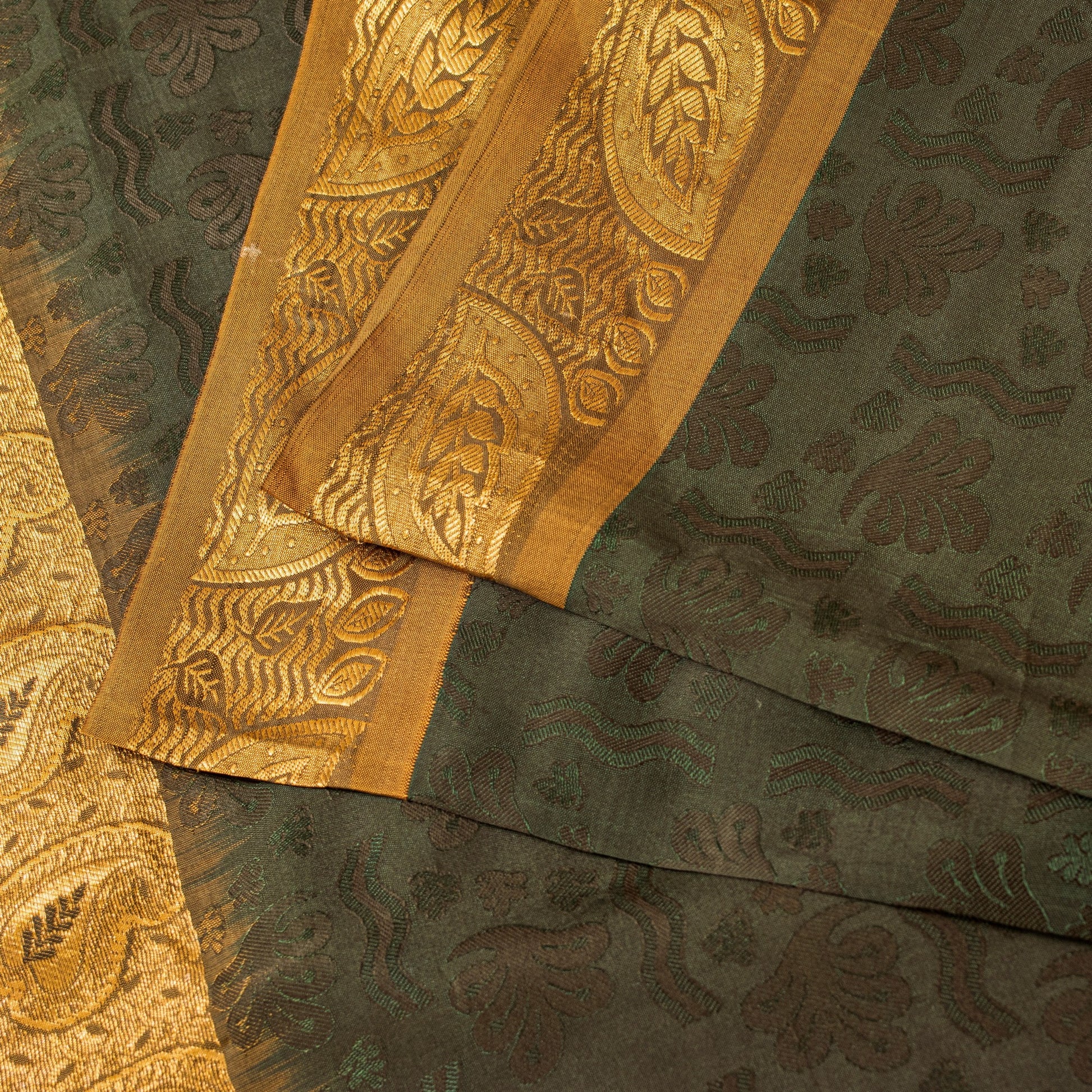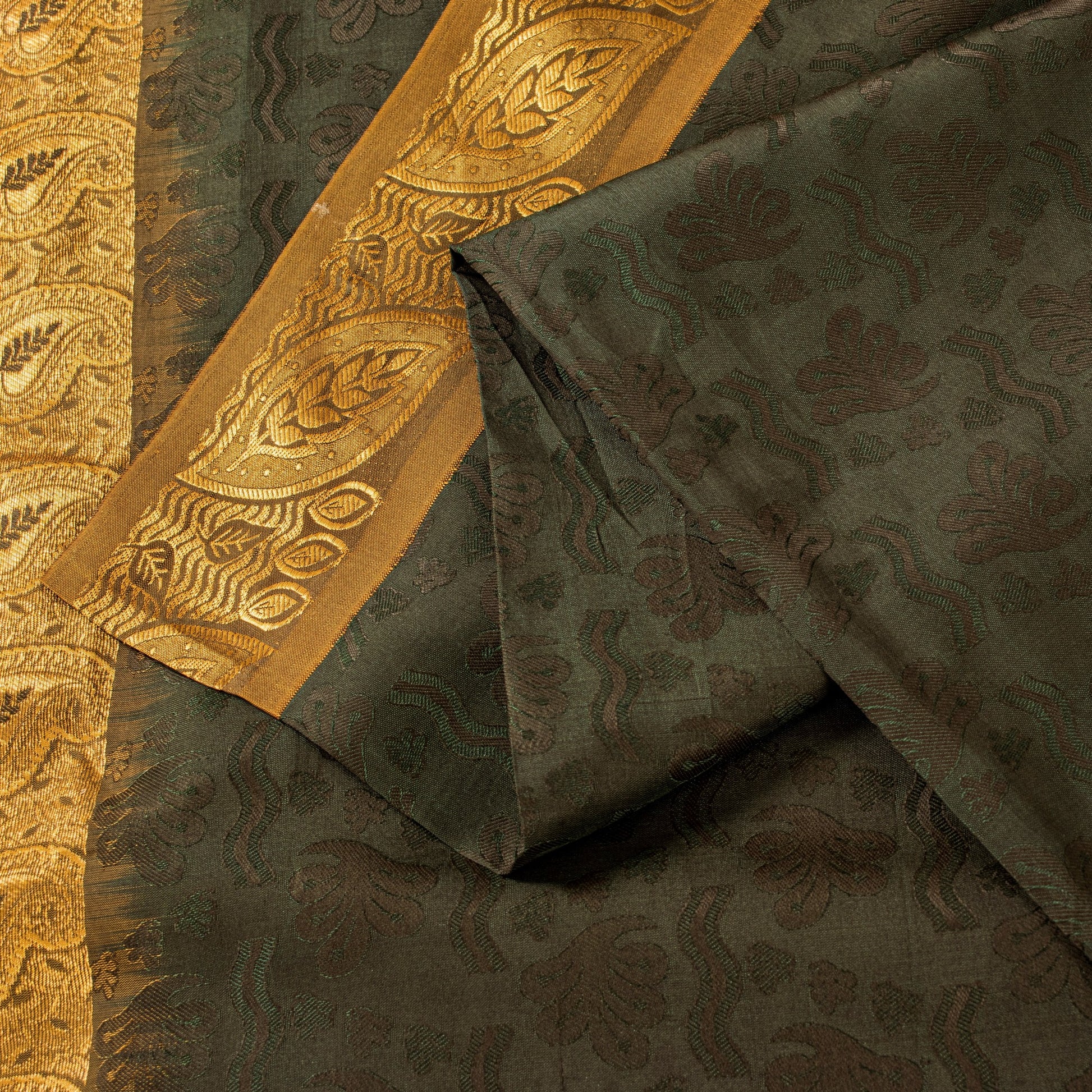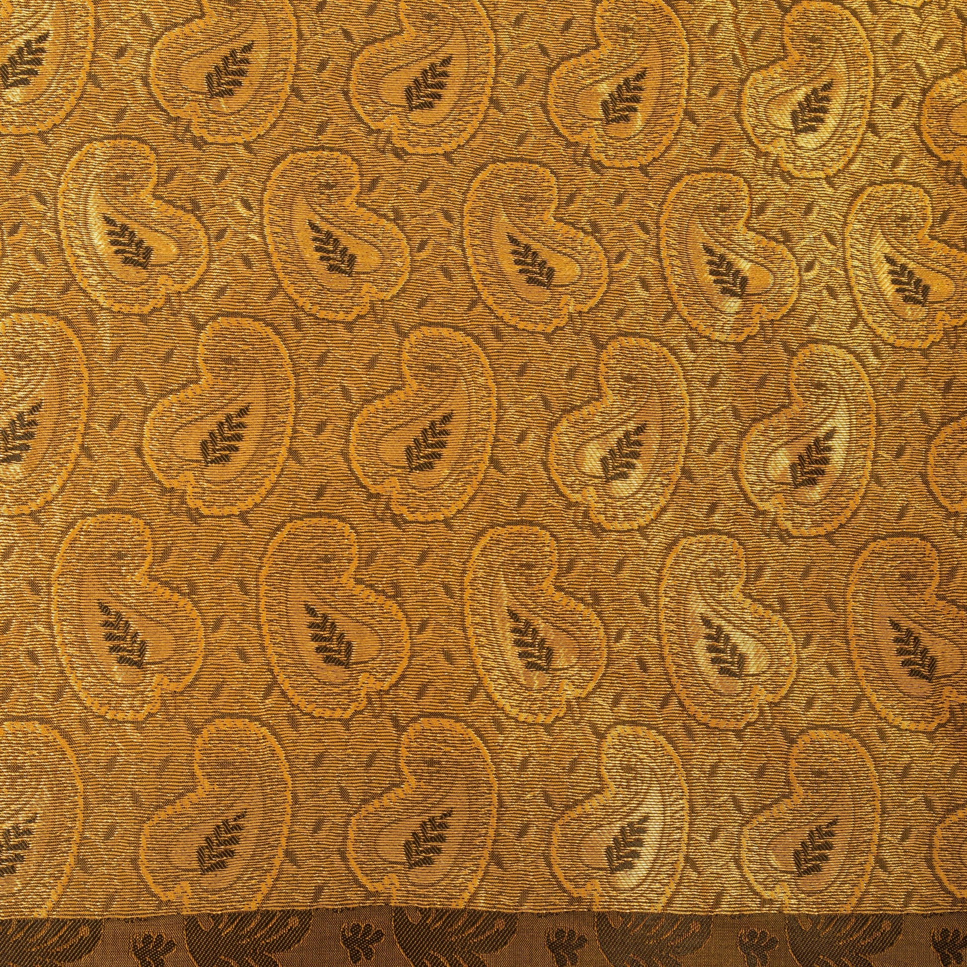 • Traditionally antique & rare to find black colored kanjivaram/Kanchipuram hand woven zari work Art silk saree. • Kanchipuram Silk is a type of silk saree made in the Kanchipuram region in Tamil Nadu, India.(This mulberry silk comes from south India and golden zari comes from Gujrat) • Pallu & border features paisley design with pure metallic golden zari hand woven work. • There are floral design with black thread woven work in center part of saree. What is special about this saree? Kanchipuram silk fabric created with three shuttles excellent weaving skills to make the saree. Kanchipuram saris woven with heavy silk and shiny cloth are considered to be special and are worn on occasions and festivities. The quality of zari work is amazing, its a pure metallic zari. Some zari work gives a antique look. This heavy saree can be used for various crafting ideas too. Use it for dress designing, table linen and much more. Let your creative juices flow! Note: This sari is not a pure silk it's artificial silk.