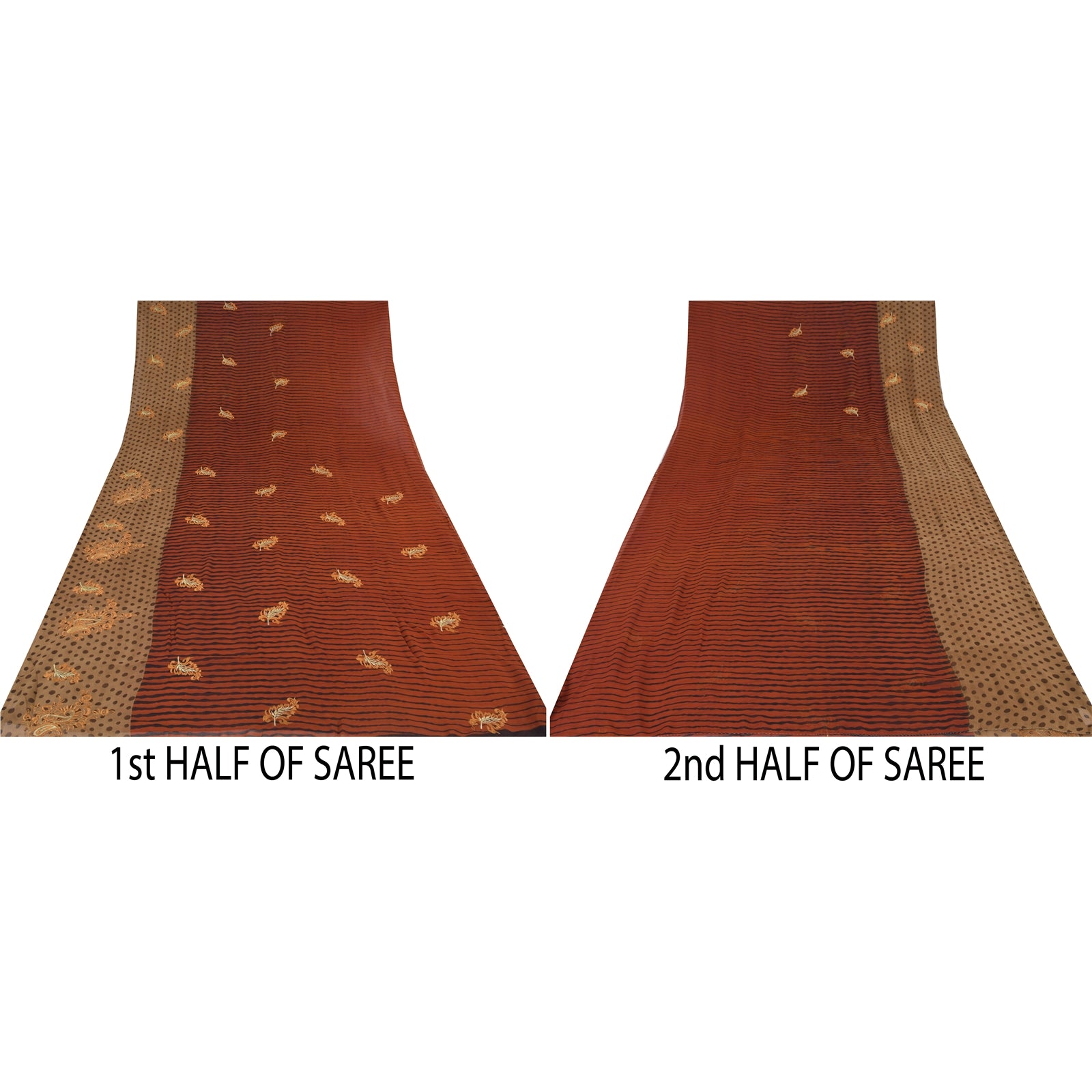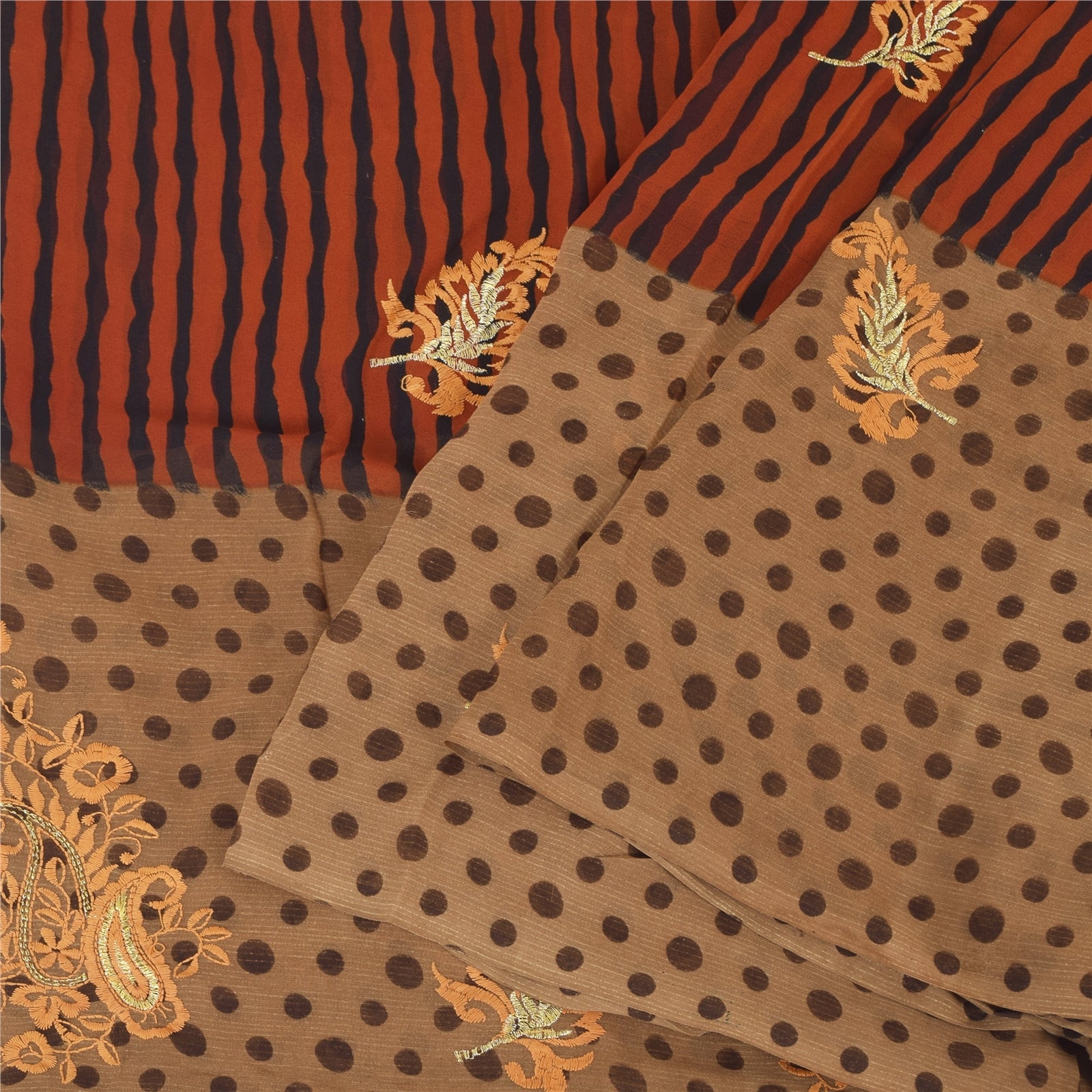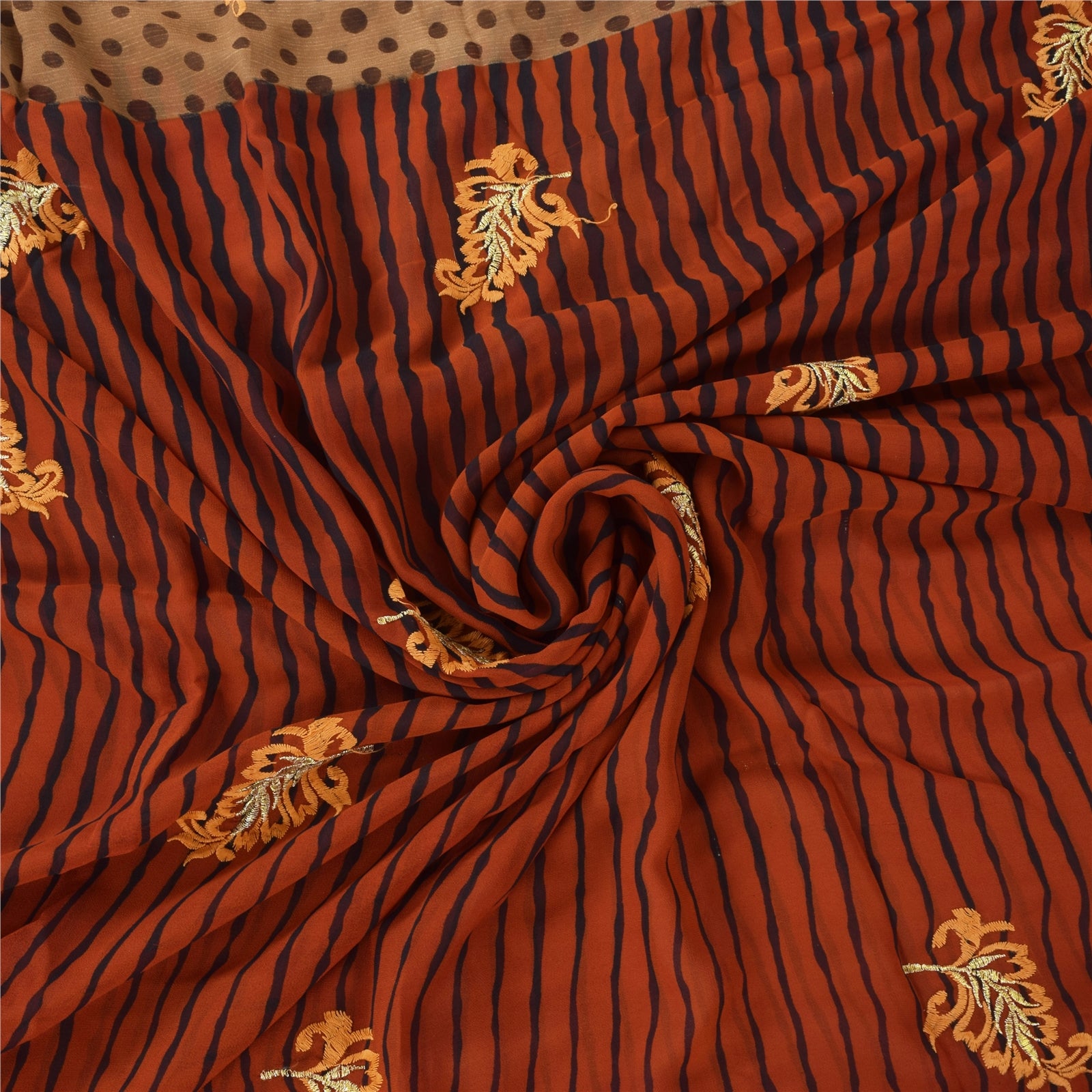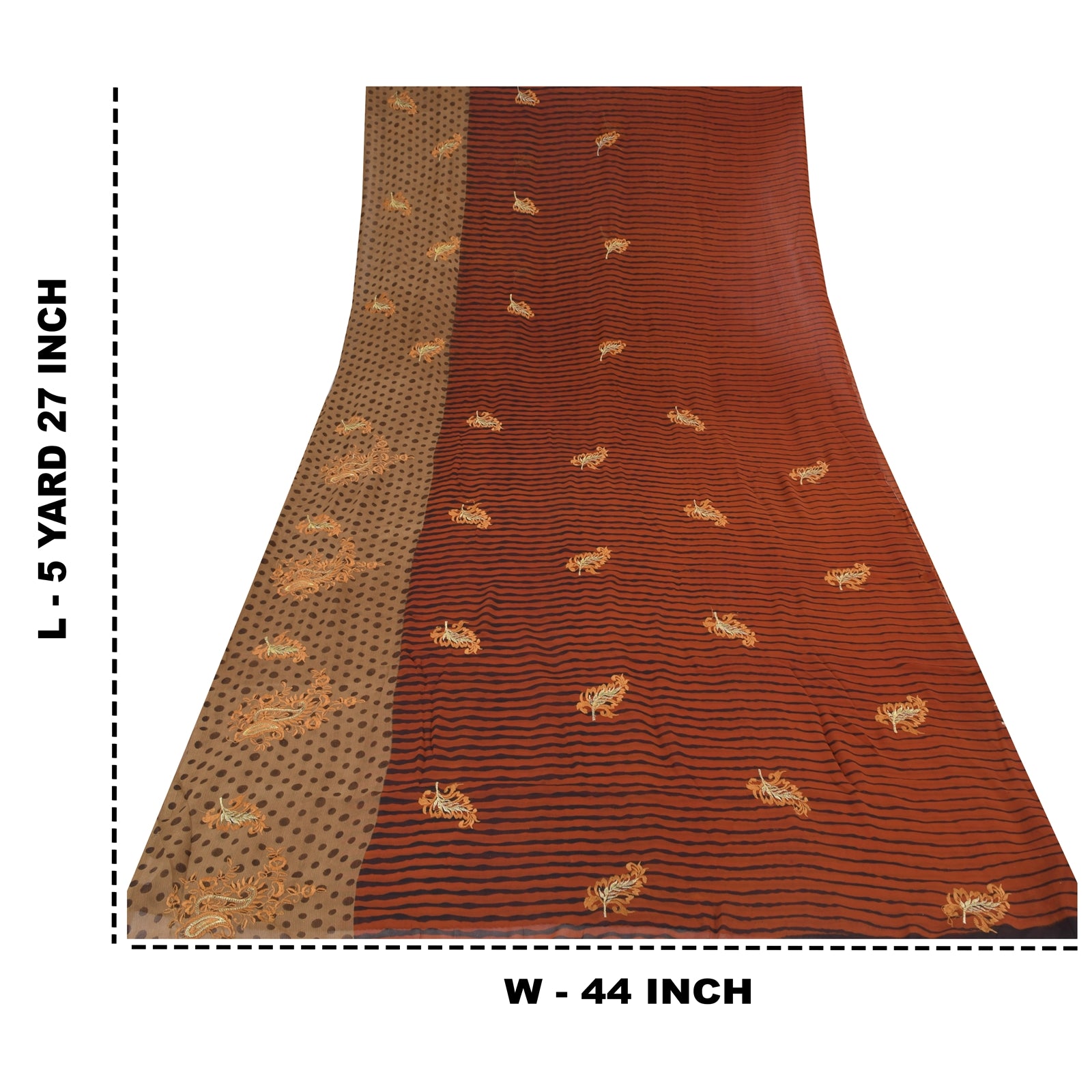 THE ITEM COLOR OR SHADE MAY BE DARKER OR LIGHTER THAN THE PICTURE.' • Beautiful Red & Brown colored embroidered printed georgette sari • All over sari features has floral, stripes & polka dot design embellished with yellow color thread work & golden zari work. A truly awesome saree. A one of a Kind. Vibrant multi color thread work with floral design on red & brown color base fabric is really enhancing the beauty of the saree. This unique vintage saree can be used for various crafting ideas even if you don't want to use it as a sari. Design a dress, use it as a throw, as window dressing, upholstery, sarongs, table linen and much more. Let your creative juices flow and use this decorated fabric in multiple fashion. Shipping note: International buyers please note: Import duties, taxes, and charges are not included in the item price or postage cost. These charges are the buyer's responsibility. Please check with your country's customs office to determine what these additional costs will be prior to bidding or buying. Buyer will pay custom duty/tax. It is calculated and charged differently by every country. As a seller I do not have any control over it. VAT or sales tax is calculated by the platform at the time of checkout. Customs charge is payable at the time of delivery. SKU: PS-31669