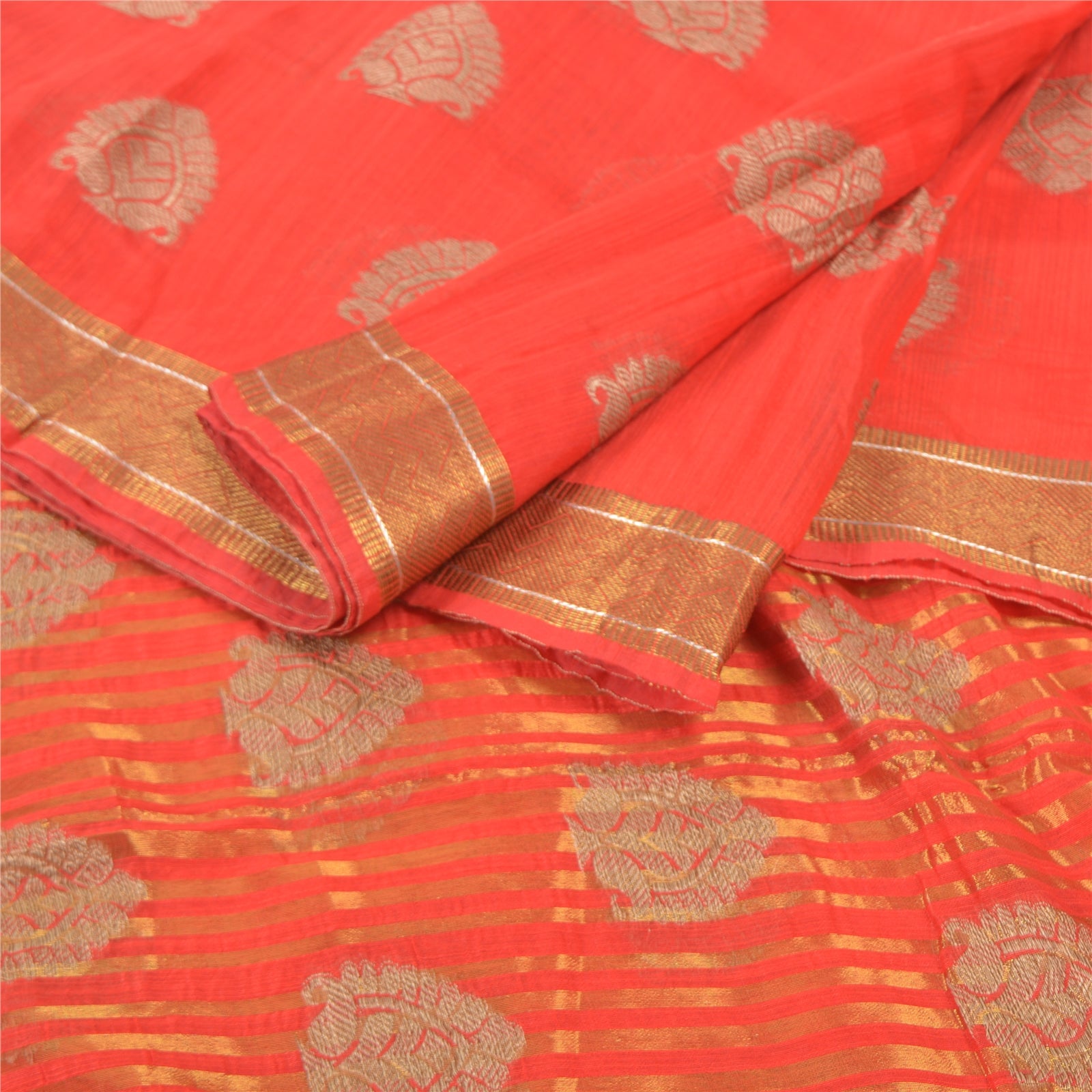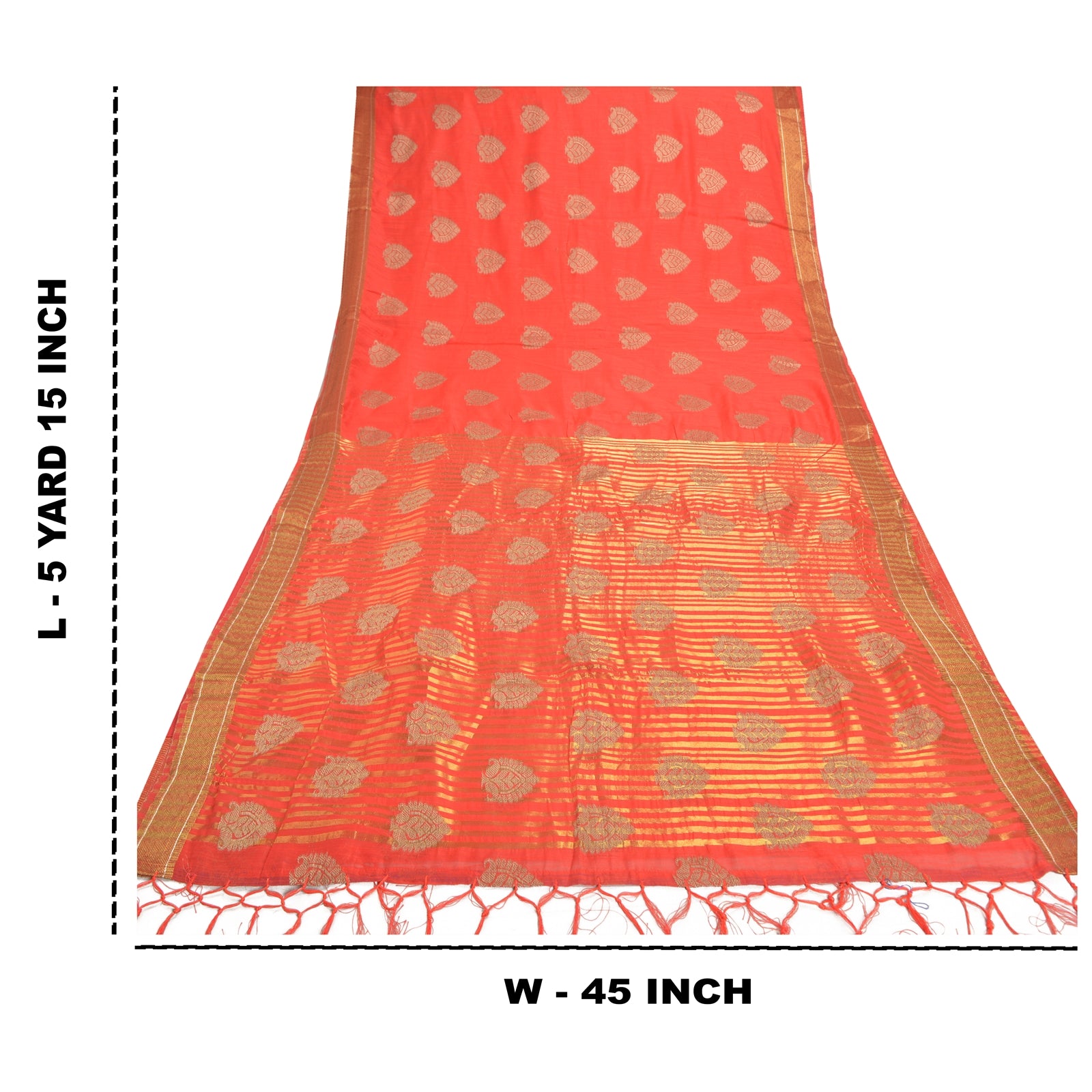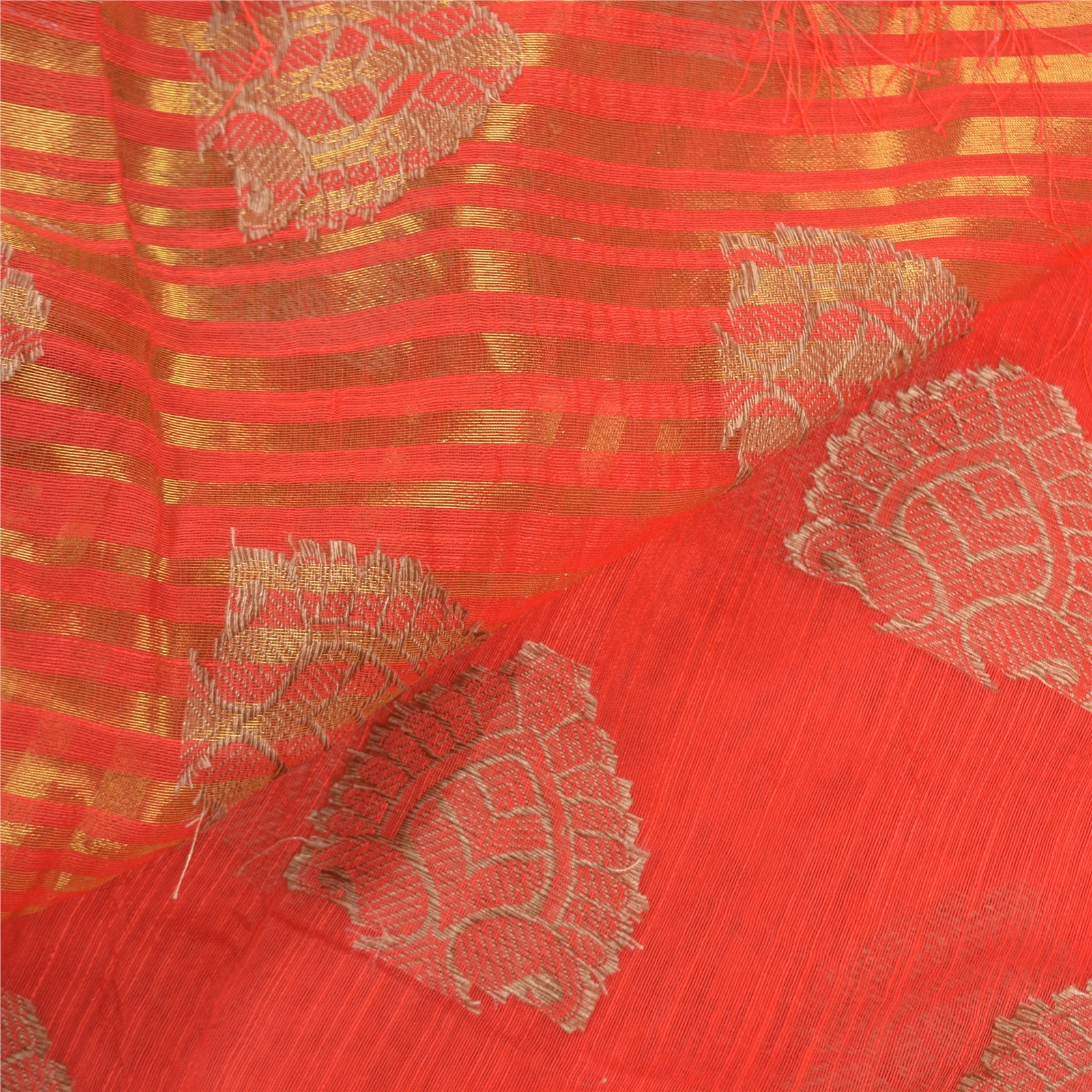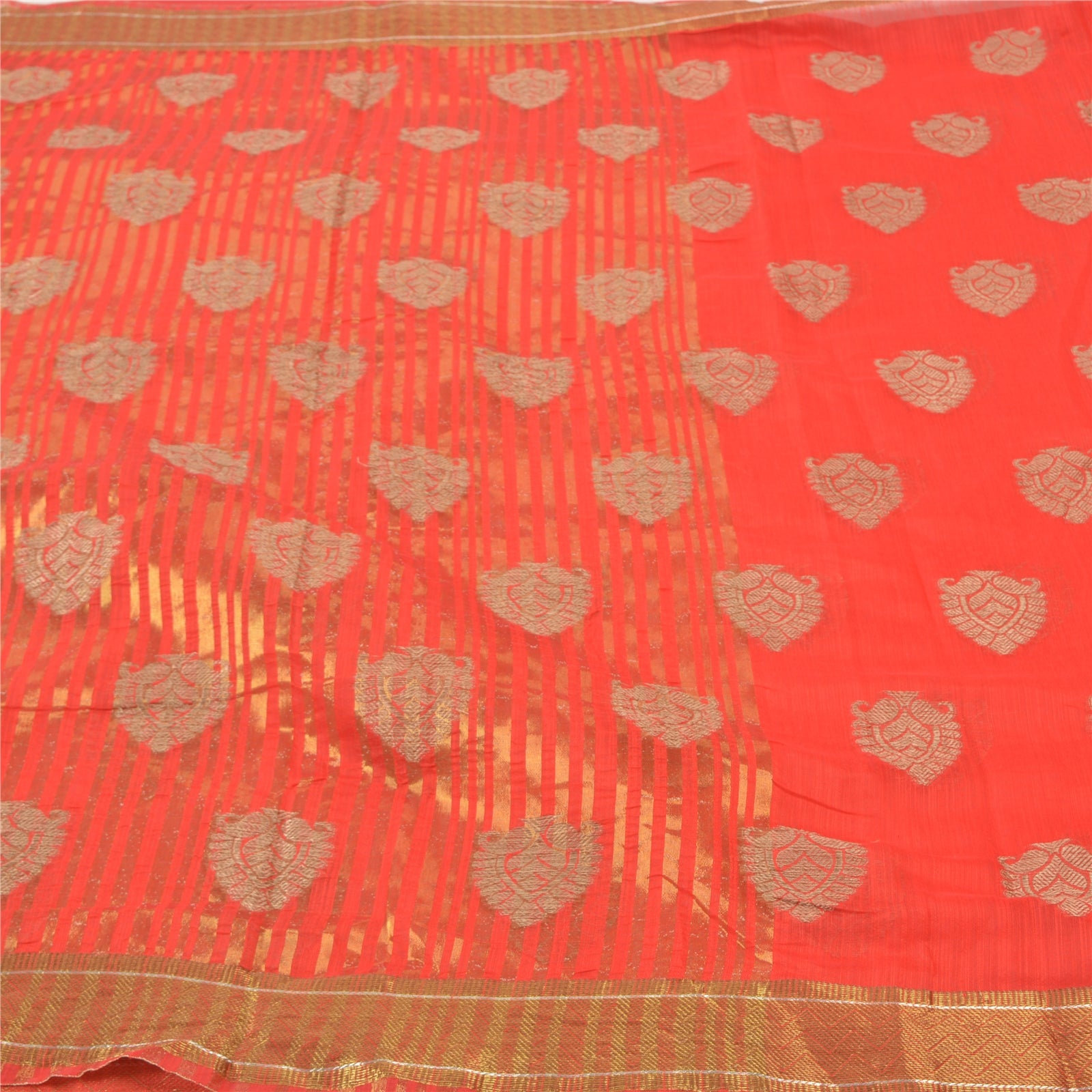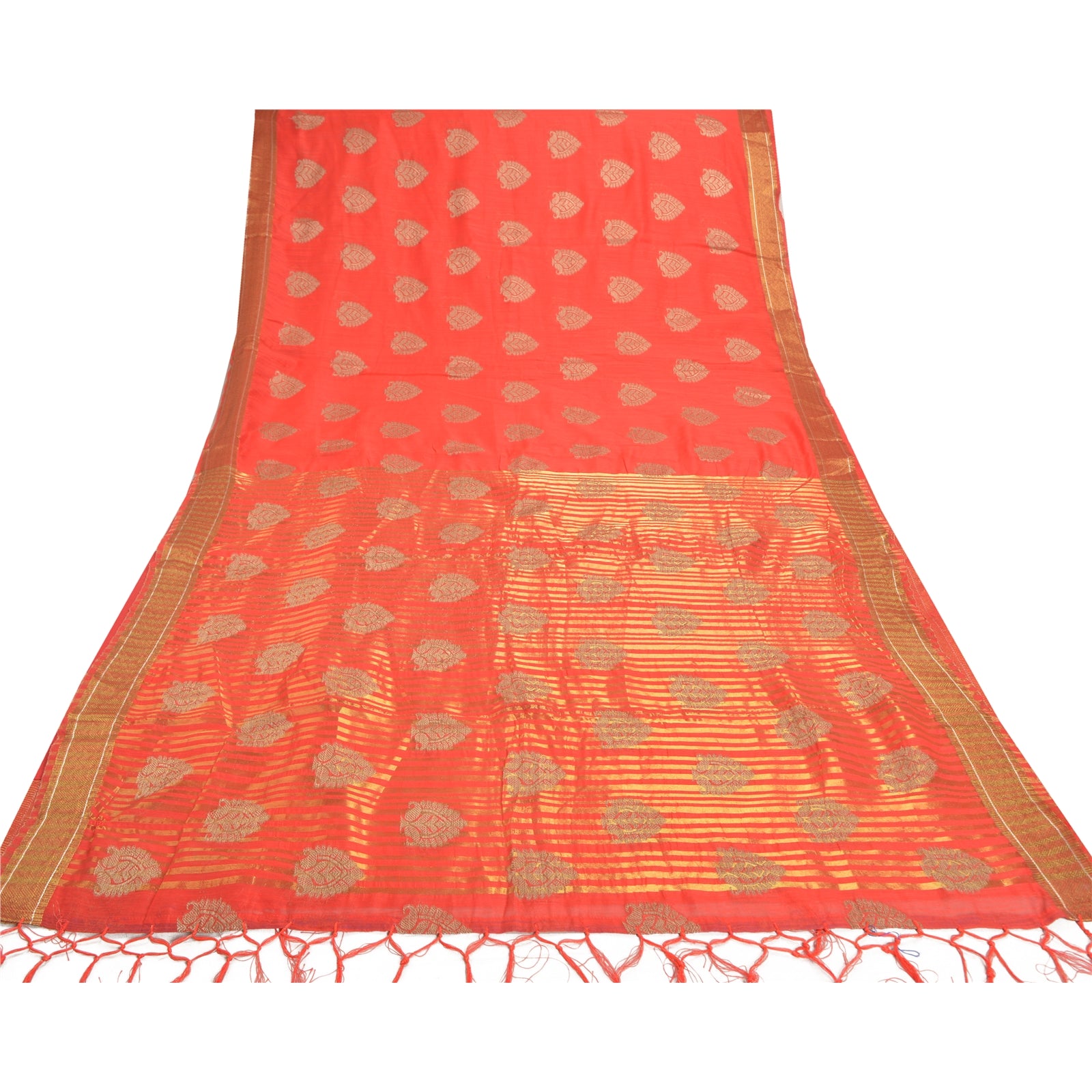 Красивое красное художественное (искусственное) шелковое тканое сари. Паллу и кайма этого сари имеют золотисто-коричневую тканую работу с цветочным и линейным узором. Красная бахрома на паллу. Вы можете увидеть похожую тканую работу с цветочным узором в центральной части сари. Это сари также можно использовать для различных идей по рукоделию. Используйте его для дизайна одежды, в качестве покрывала, для оформления окон, обивки, столового белья и многого другого. Дайте волю своим творческим сокам.