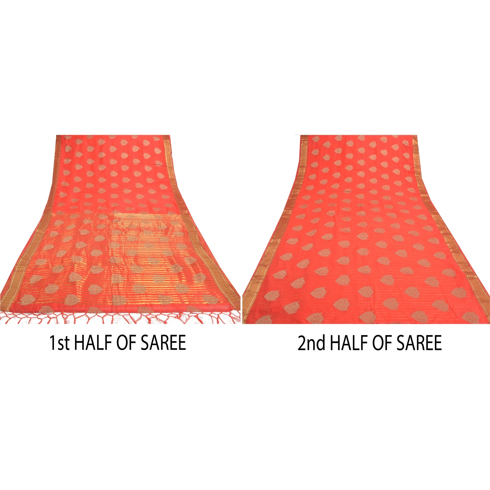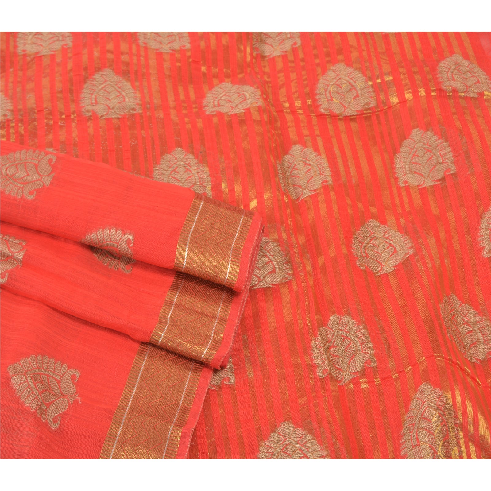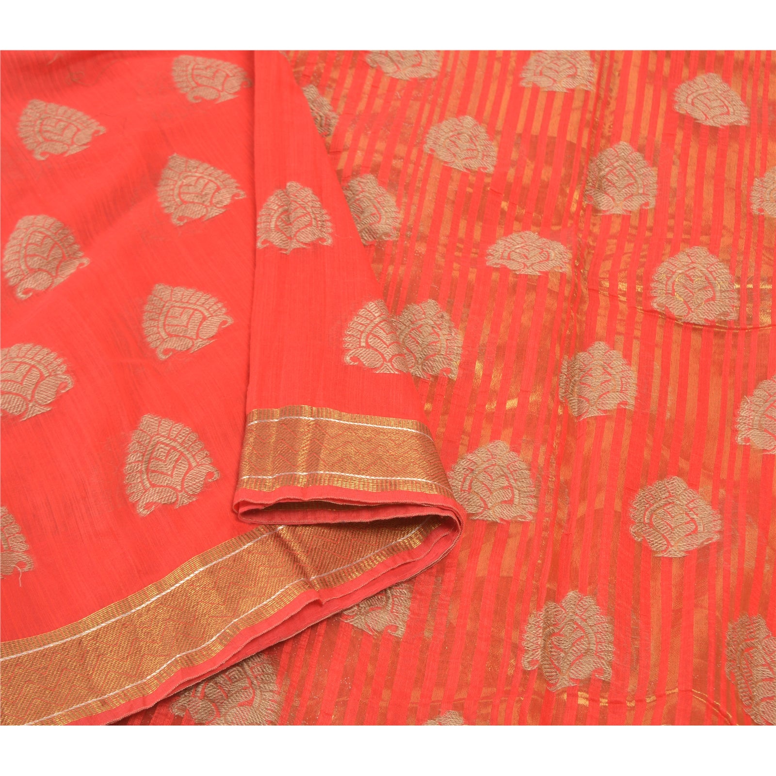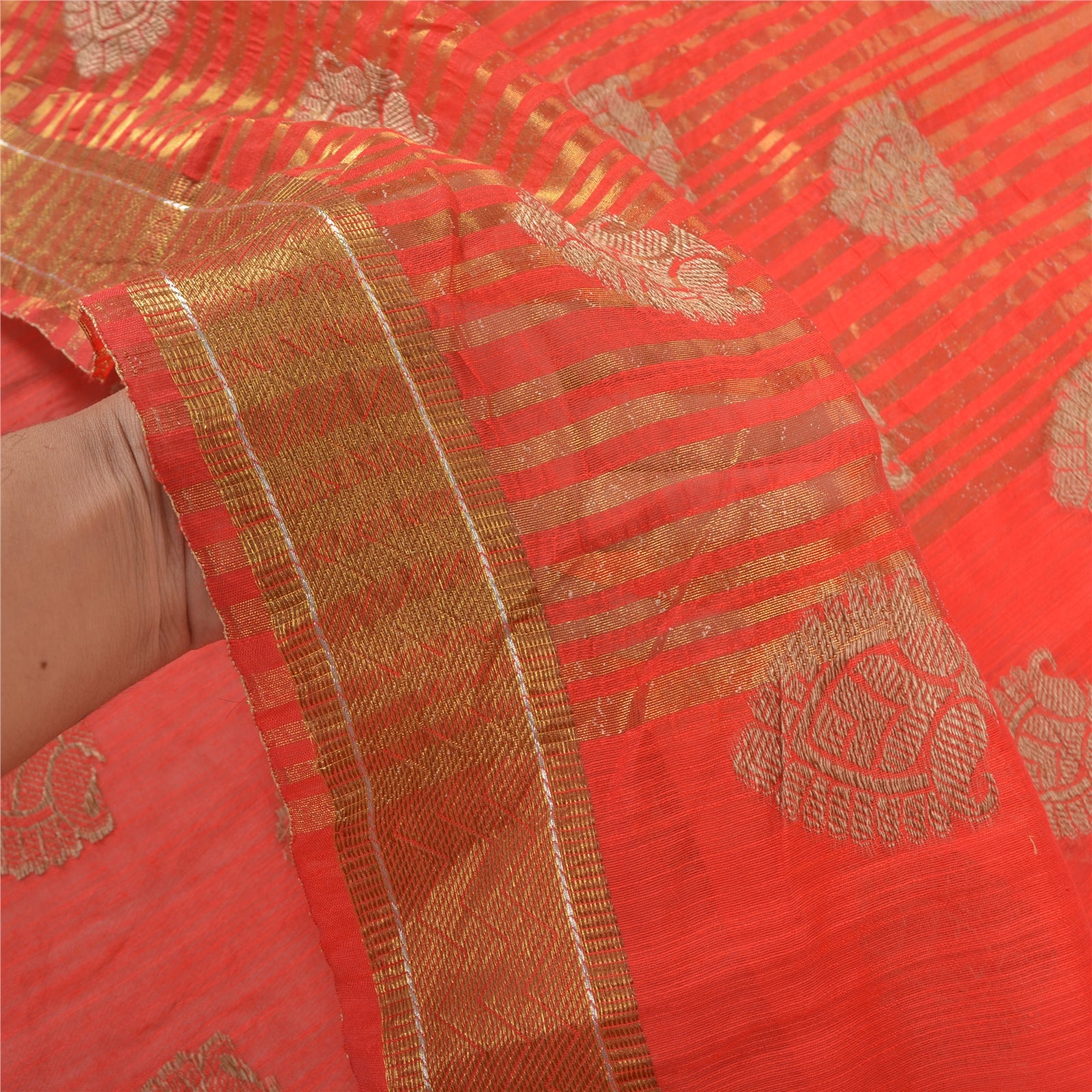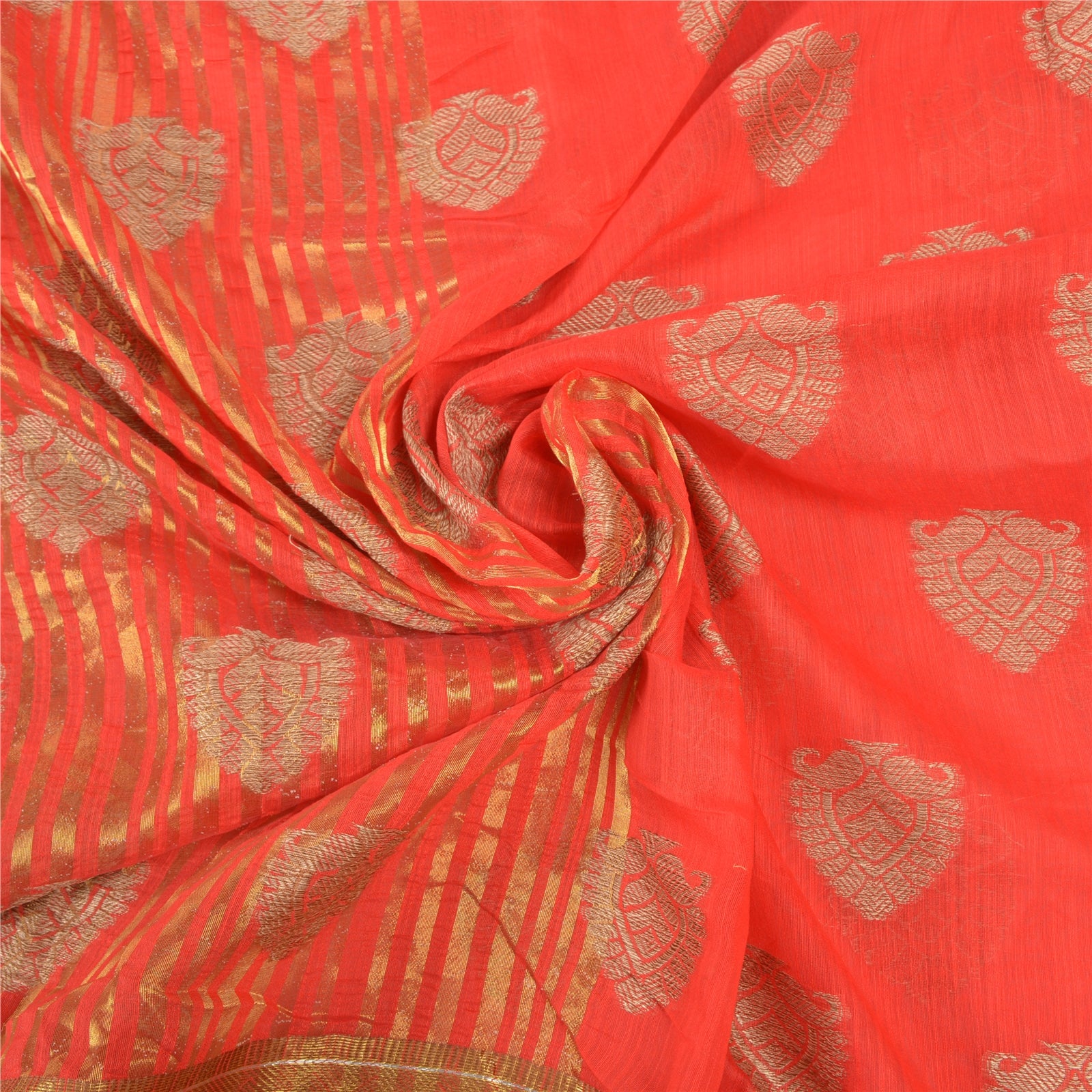 Красивое красное художественное (искусственное) шелковое тканое сари. Паллу и кайма этого сари имеют золотисто-коричневую тканую работу с цветочным и линейным узором. Красная бахрома на паллу. Вы можете увидеть похожую тканую работу с цветочным узором в центральной части сари. Это сари также можно использовать для различных идей по рукоделию. Используйте его для дизайна одежды, в качестве покрывала, для оформления окон, обивки, столового белья и многого другого. Дайте волю своим творческим сокам.