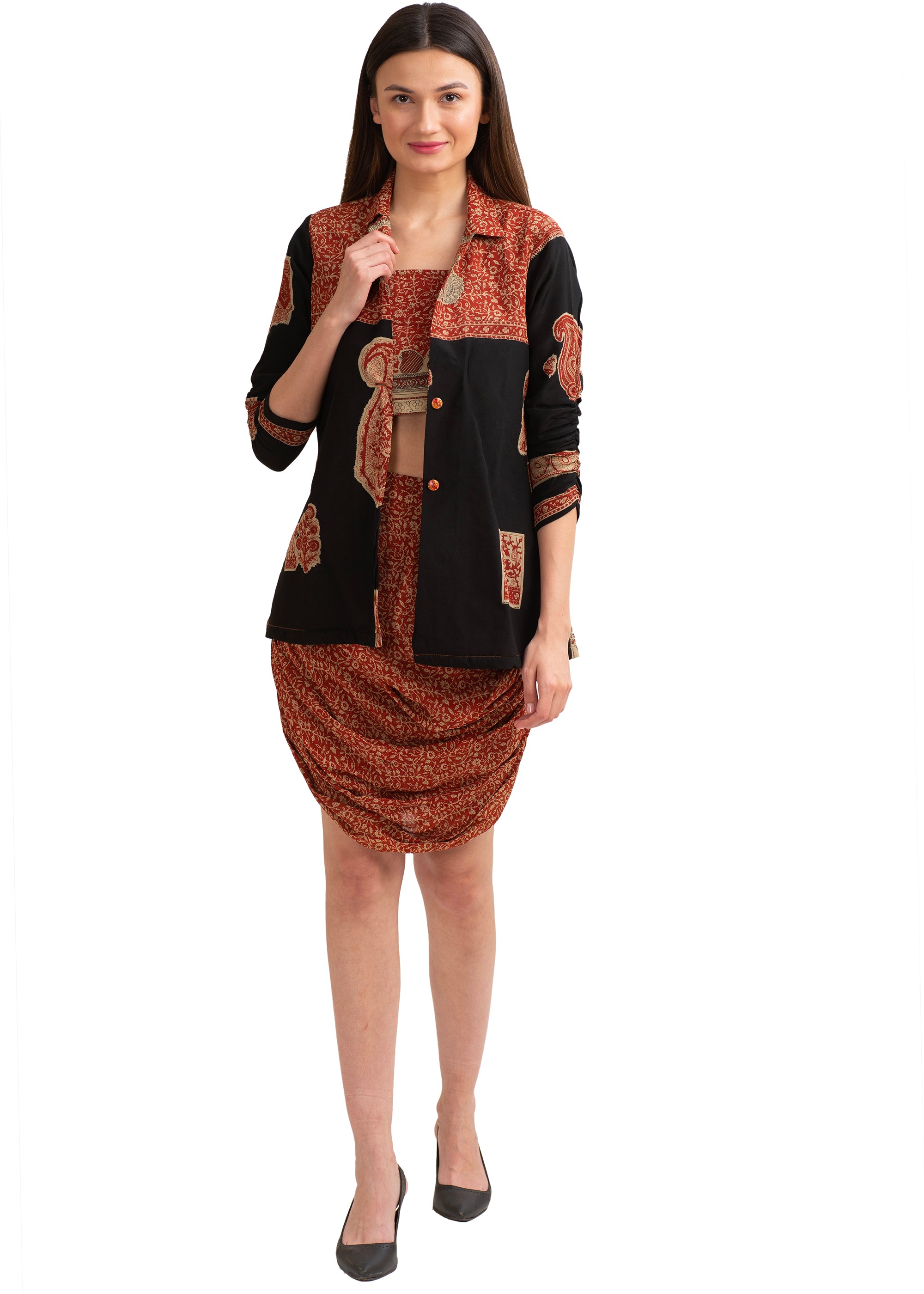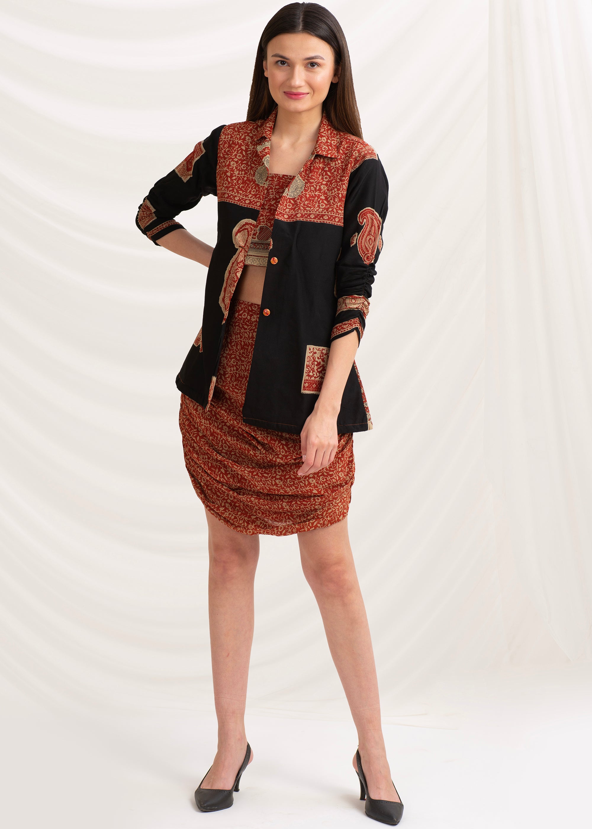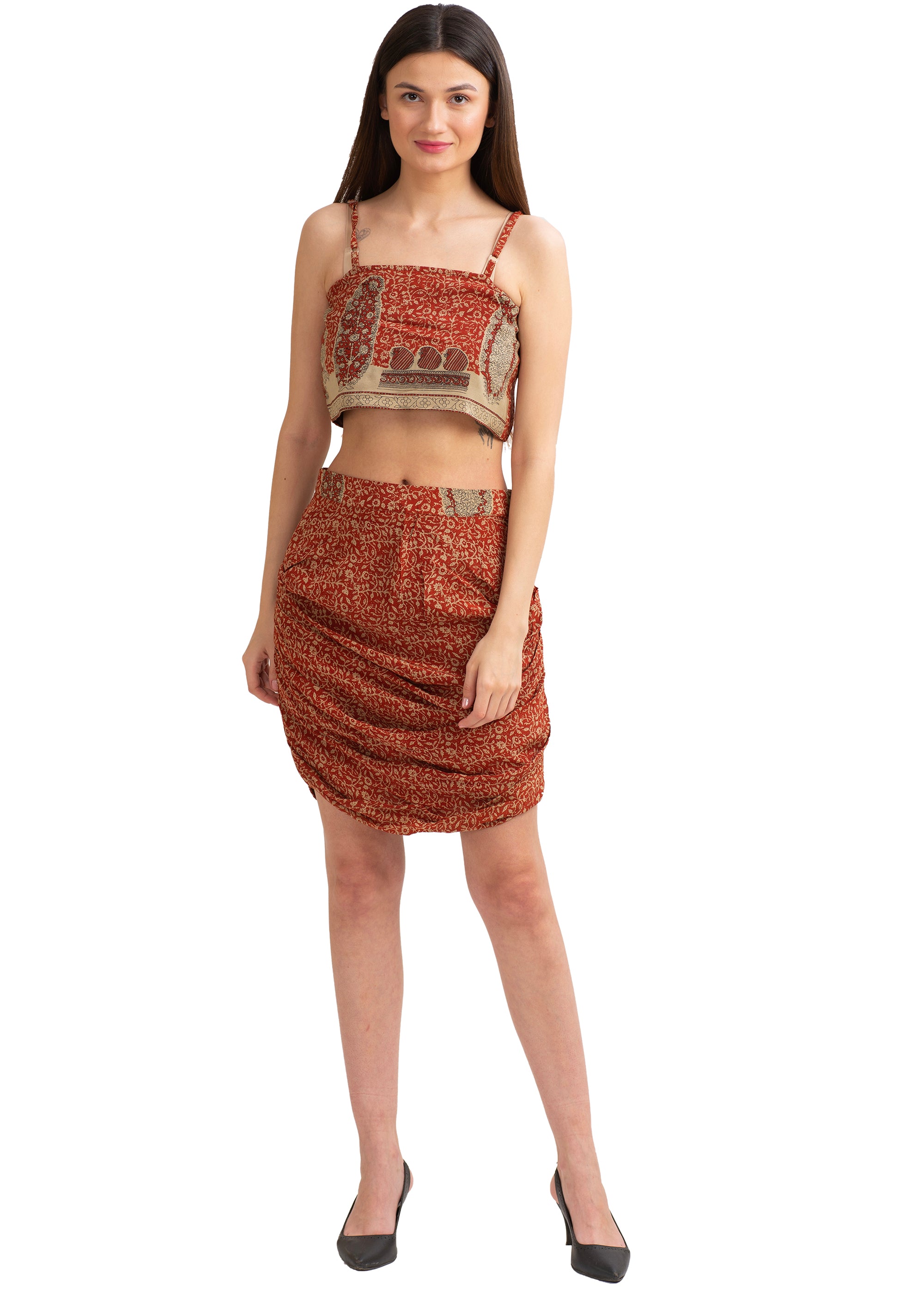 - Этот наряд был переработан из винтажного шелкового сари, купленного в собственном магазине Sanskriti Vintage. Использованная устойчивая ткань: чистый крепированный шелк с принтом