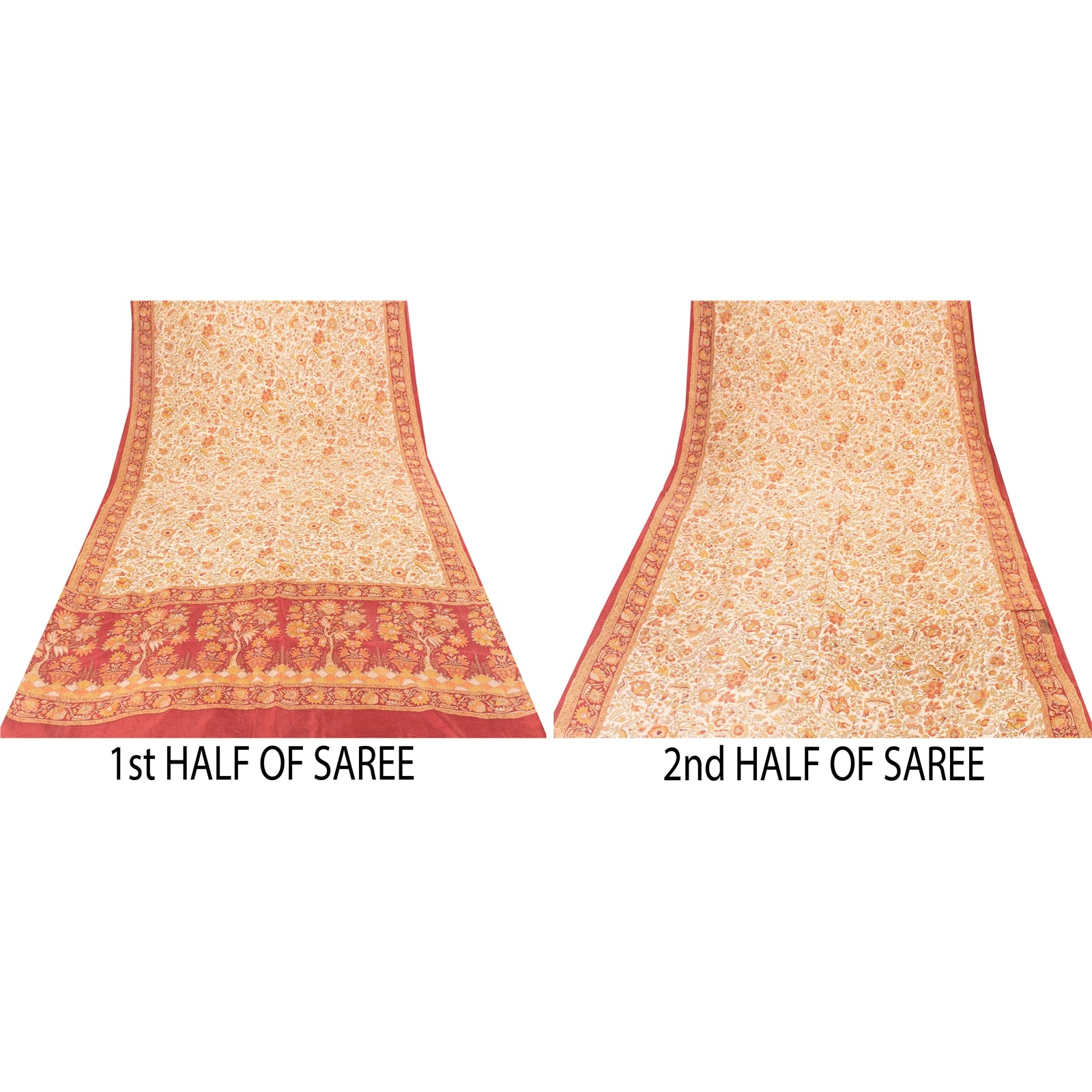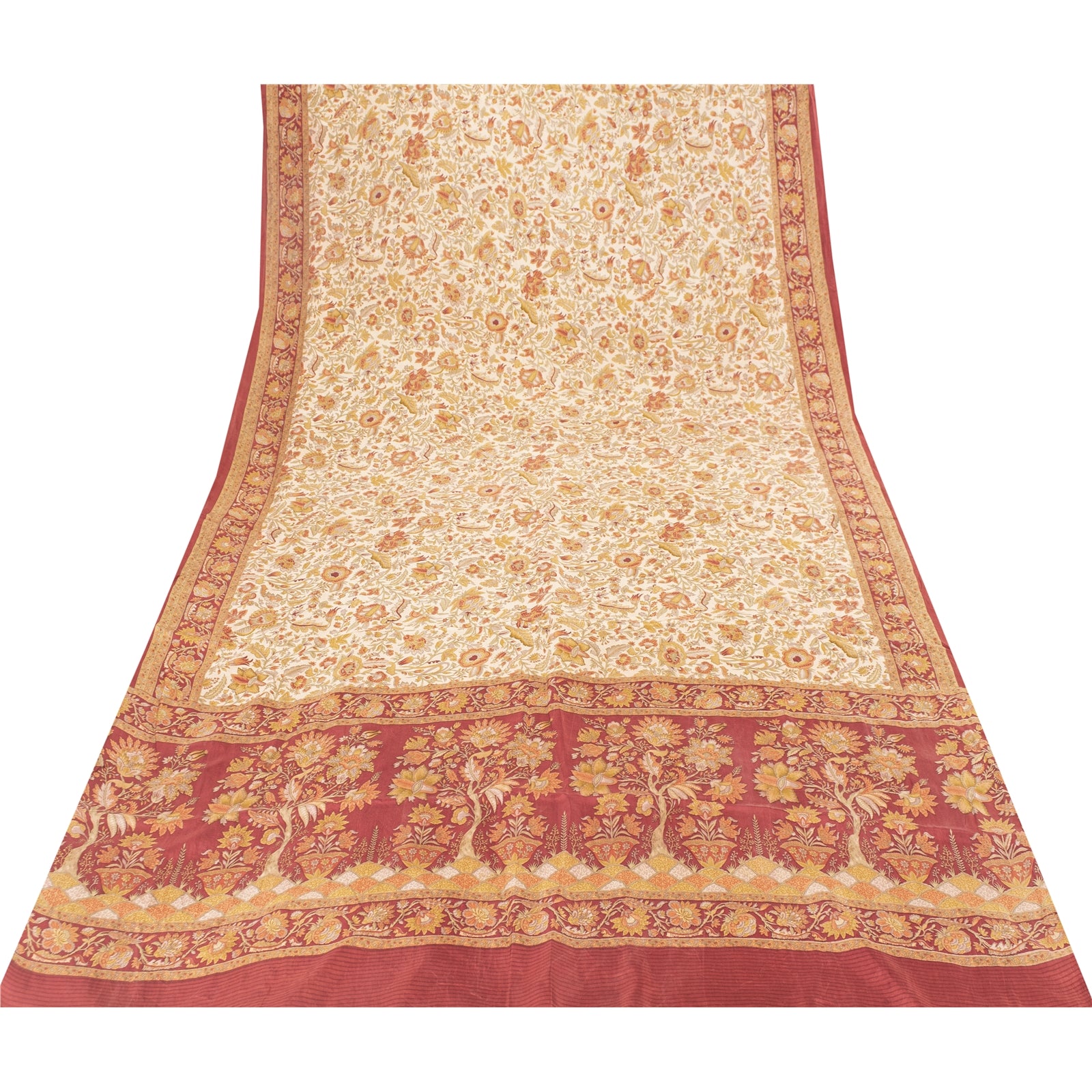 Sanskriti Vintage Sarees Cream Pure Silk Floral Printed Sari 5+yd Craft Fabric