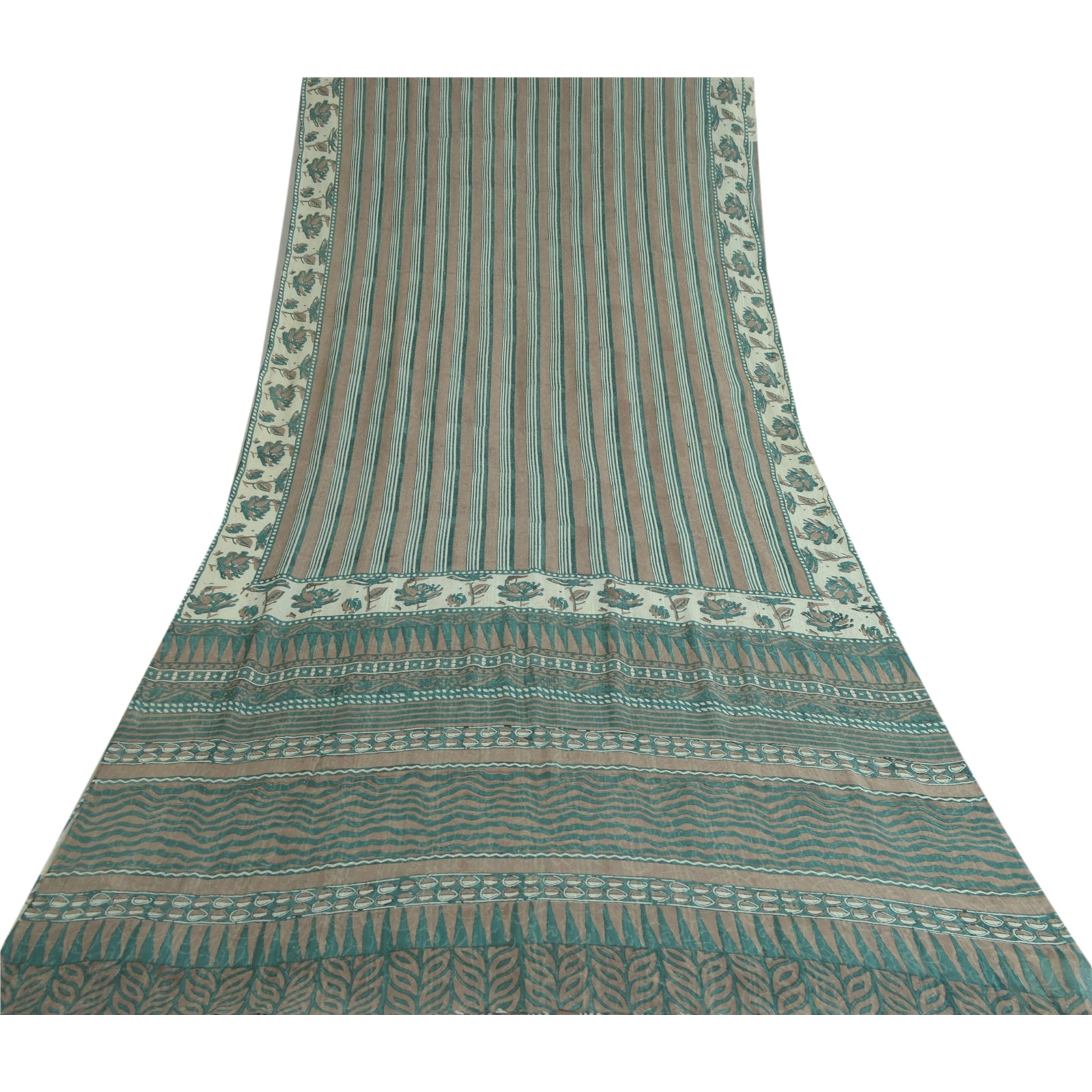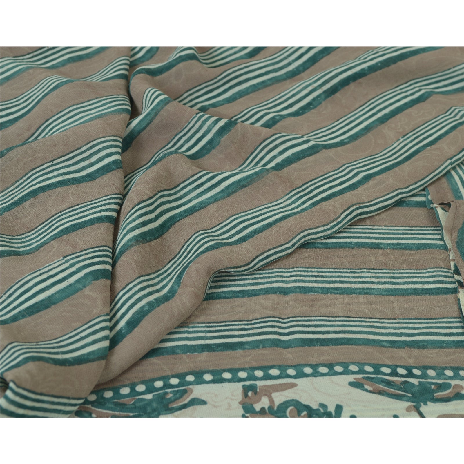 Sanskriti Vintage Sarees Green/Brown Hand Block Pure Georgette Print Sari Fabric