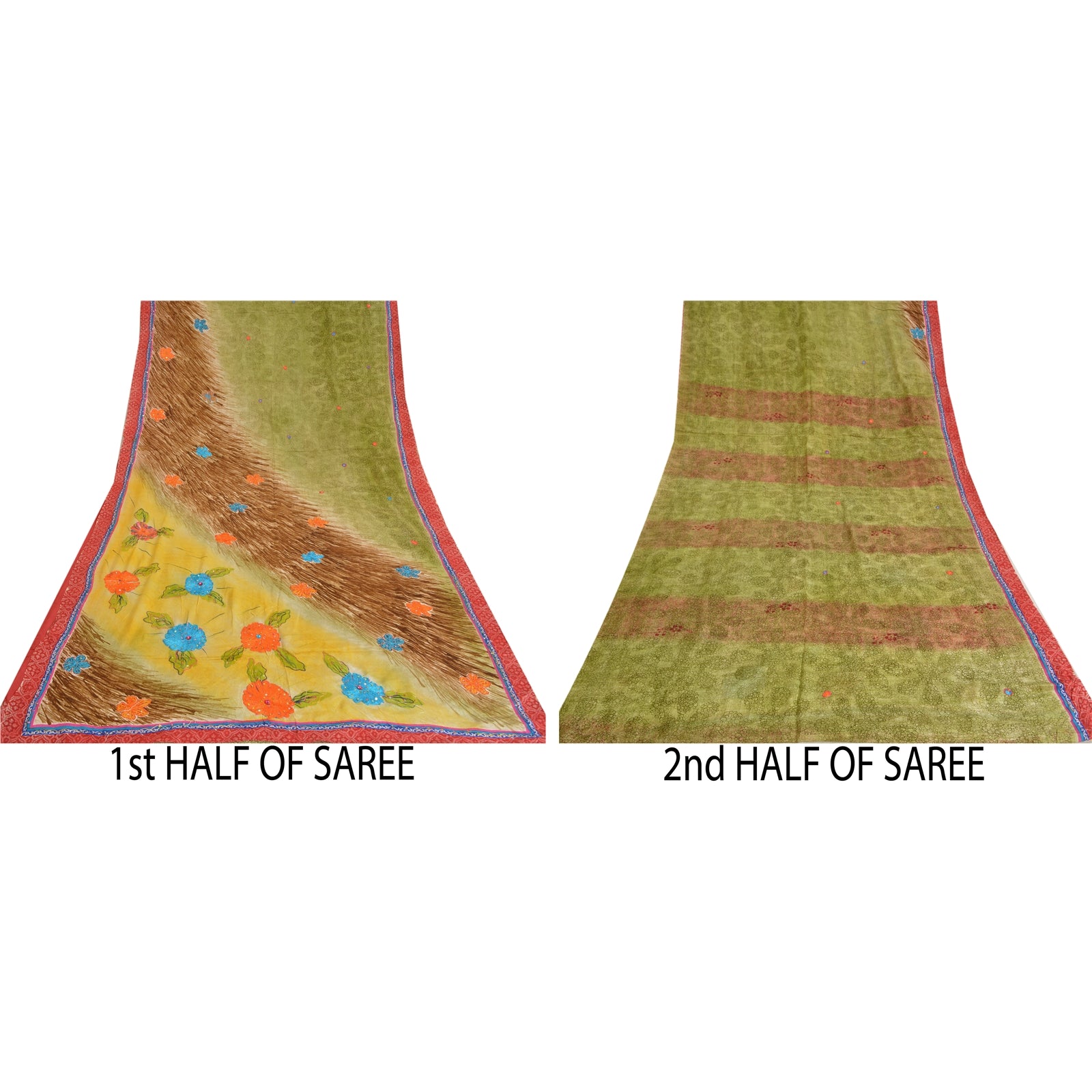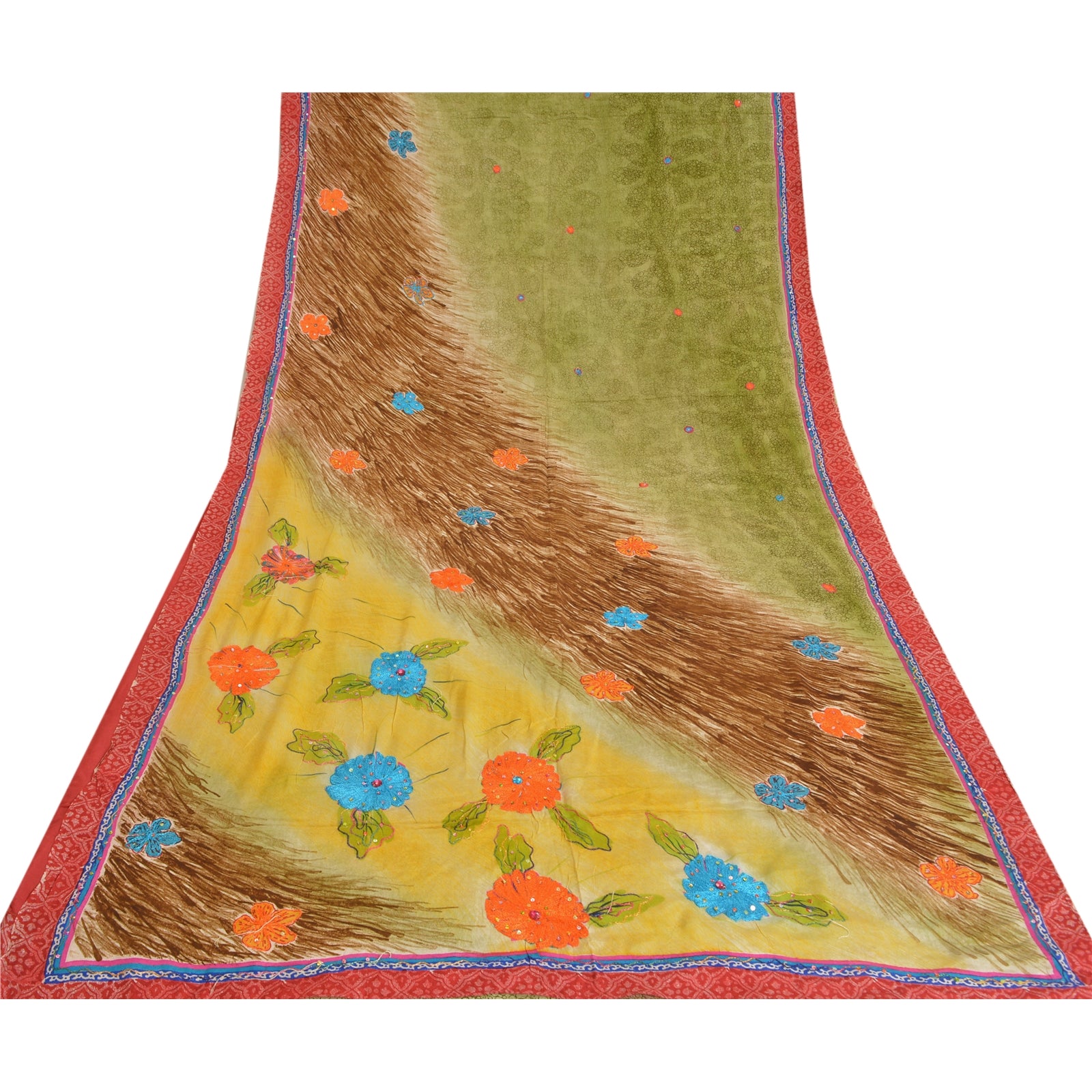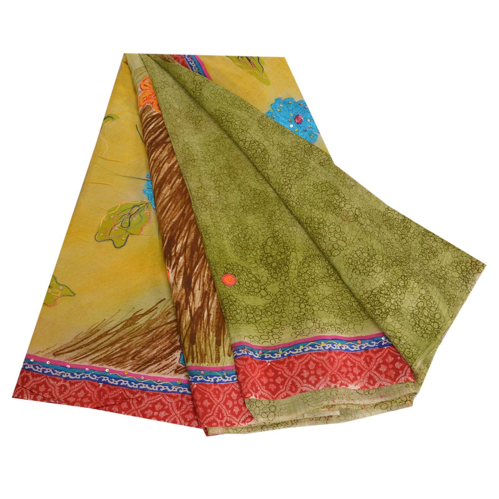 Сари в винтажном стиле на санскрите, зеленое с ручным принтом бисера, чистое креповое шелковое сари, ткань для рукоделия, устойчивая к истиранию
