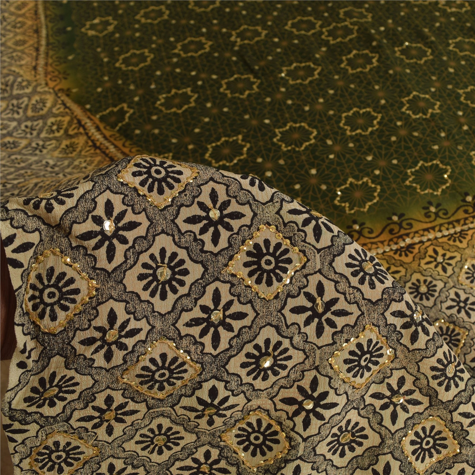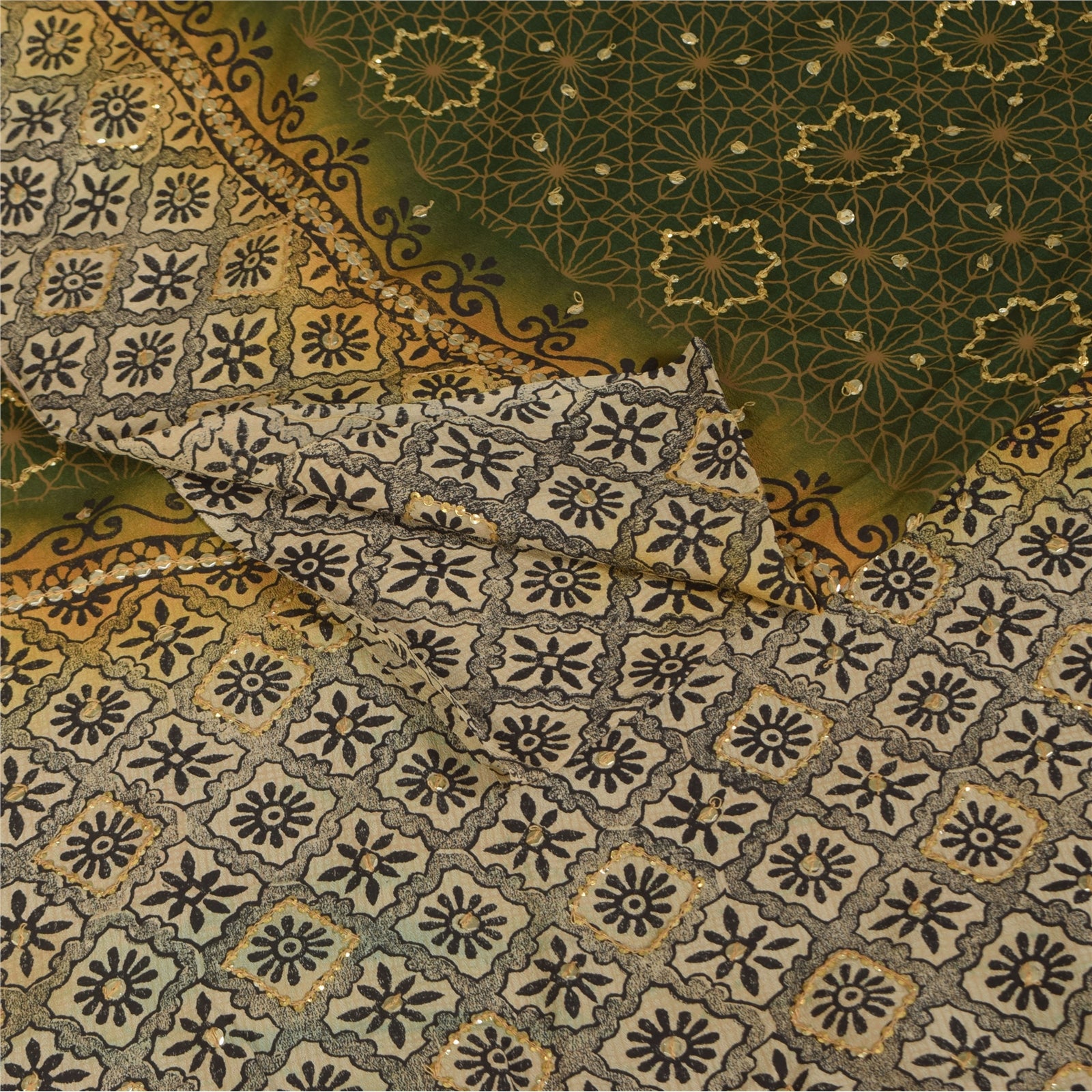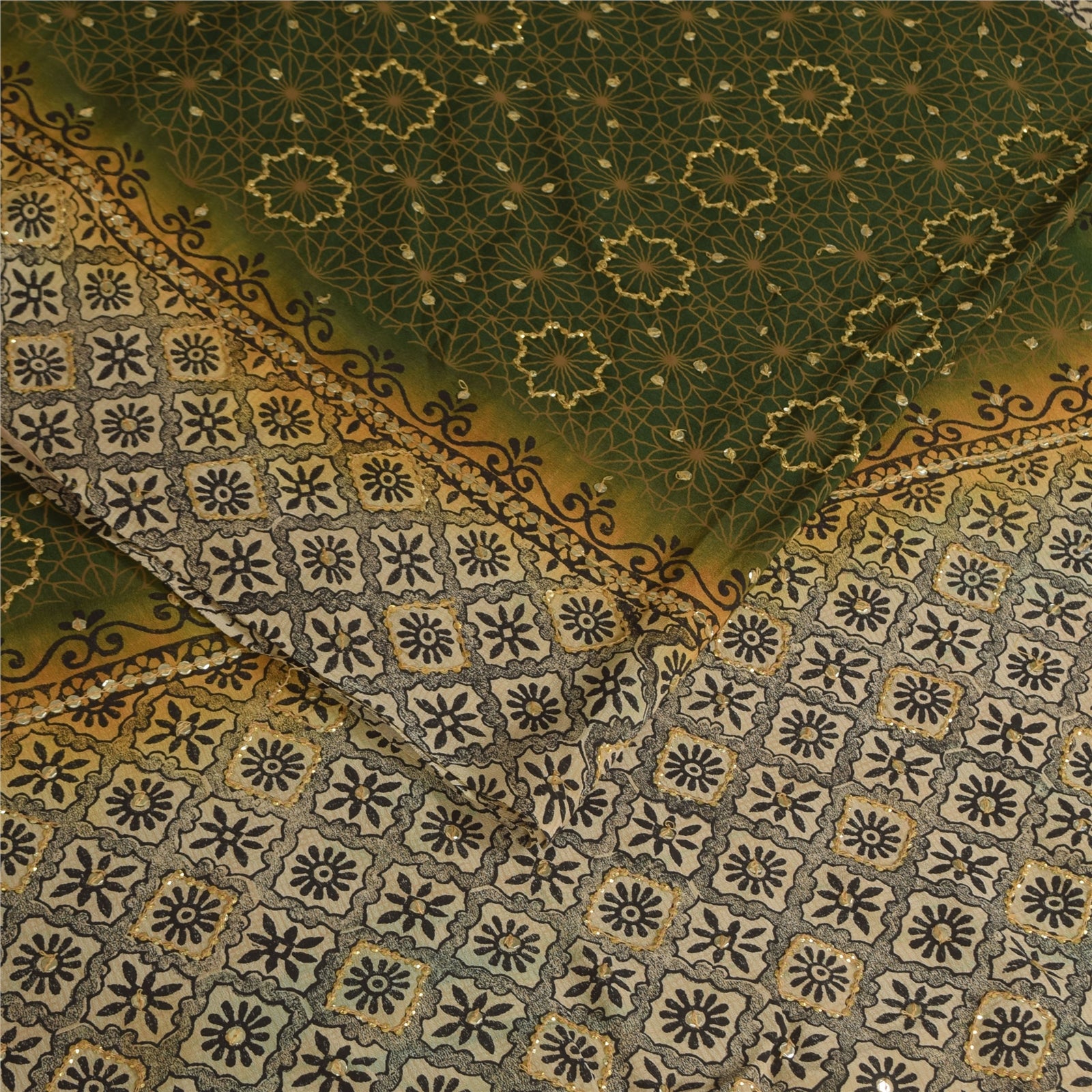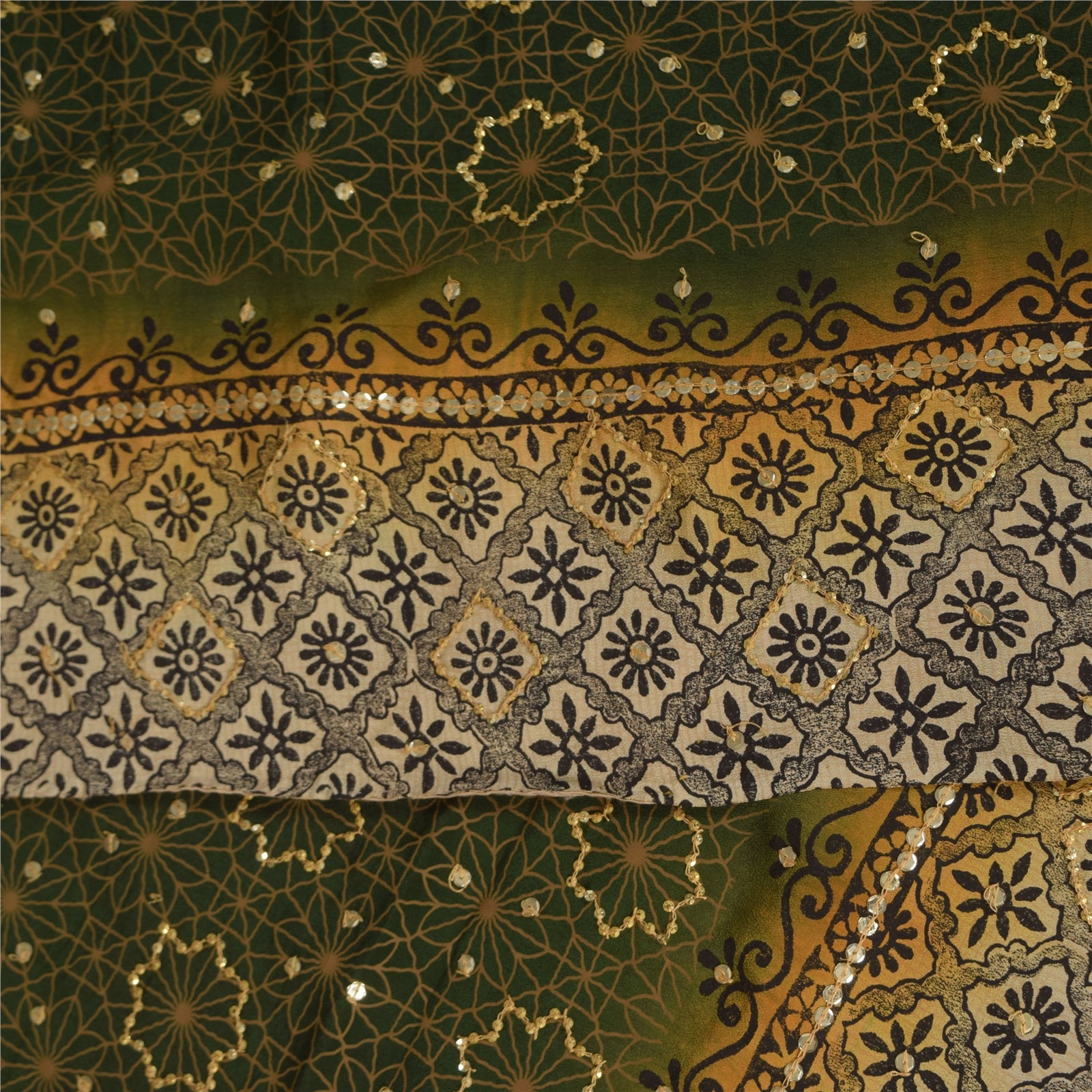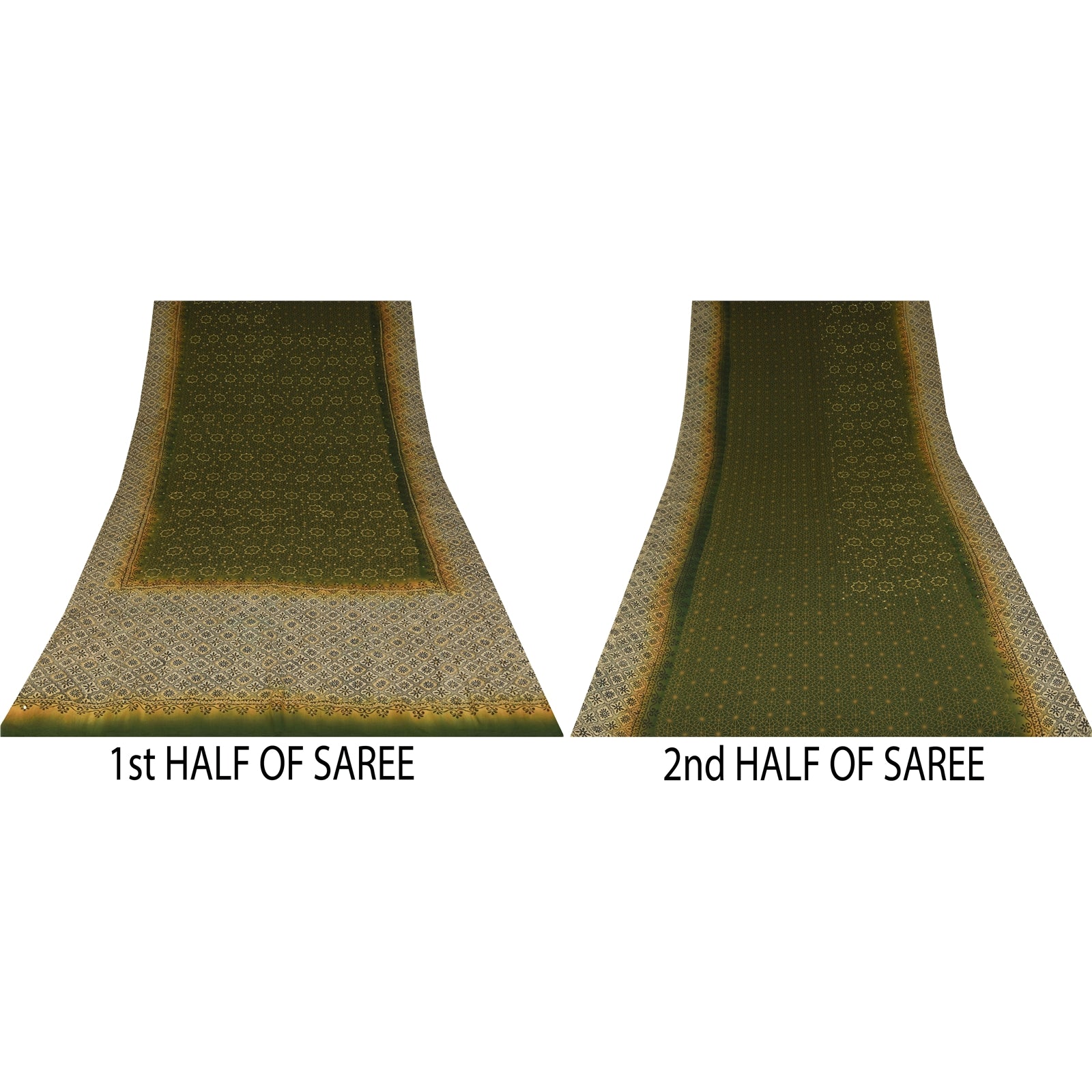 Sanskriti Vintage Sarees Green Pure Crepe Silk Printed Sari 5+yd Craft Fabric