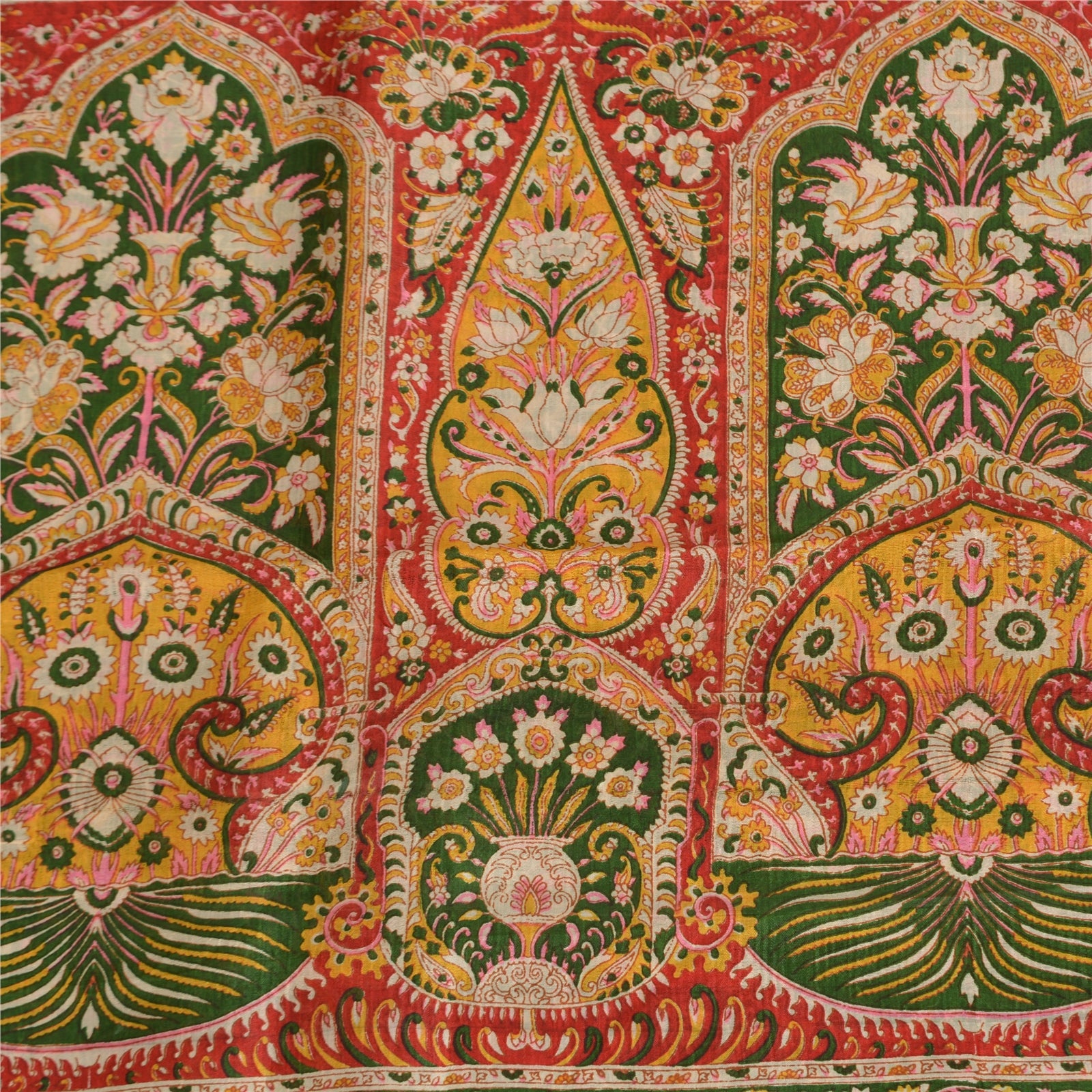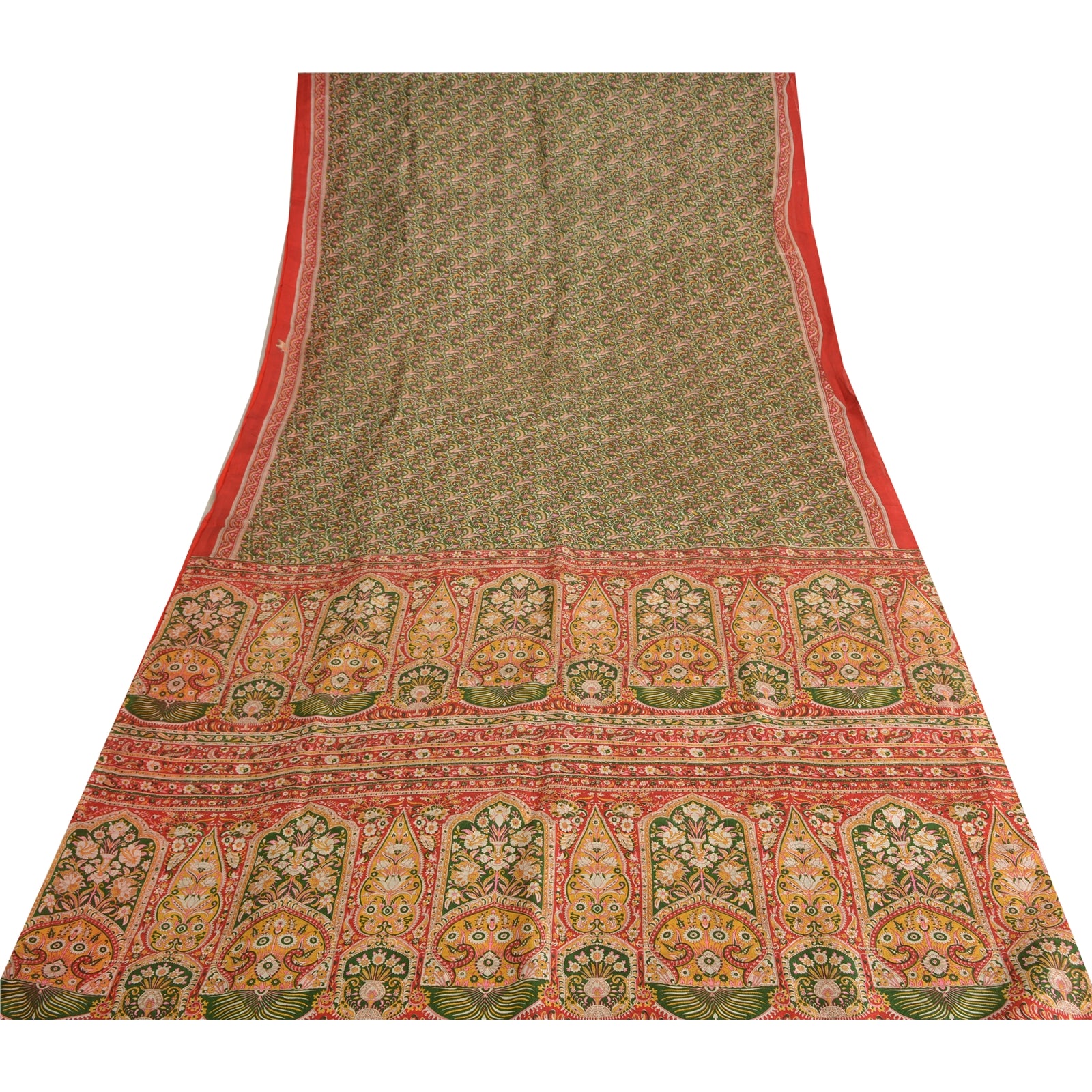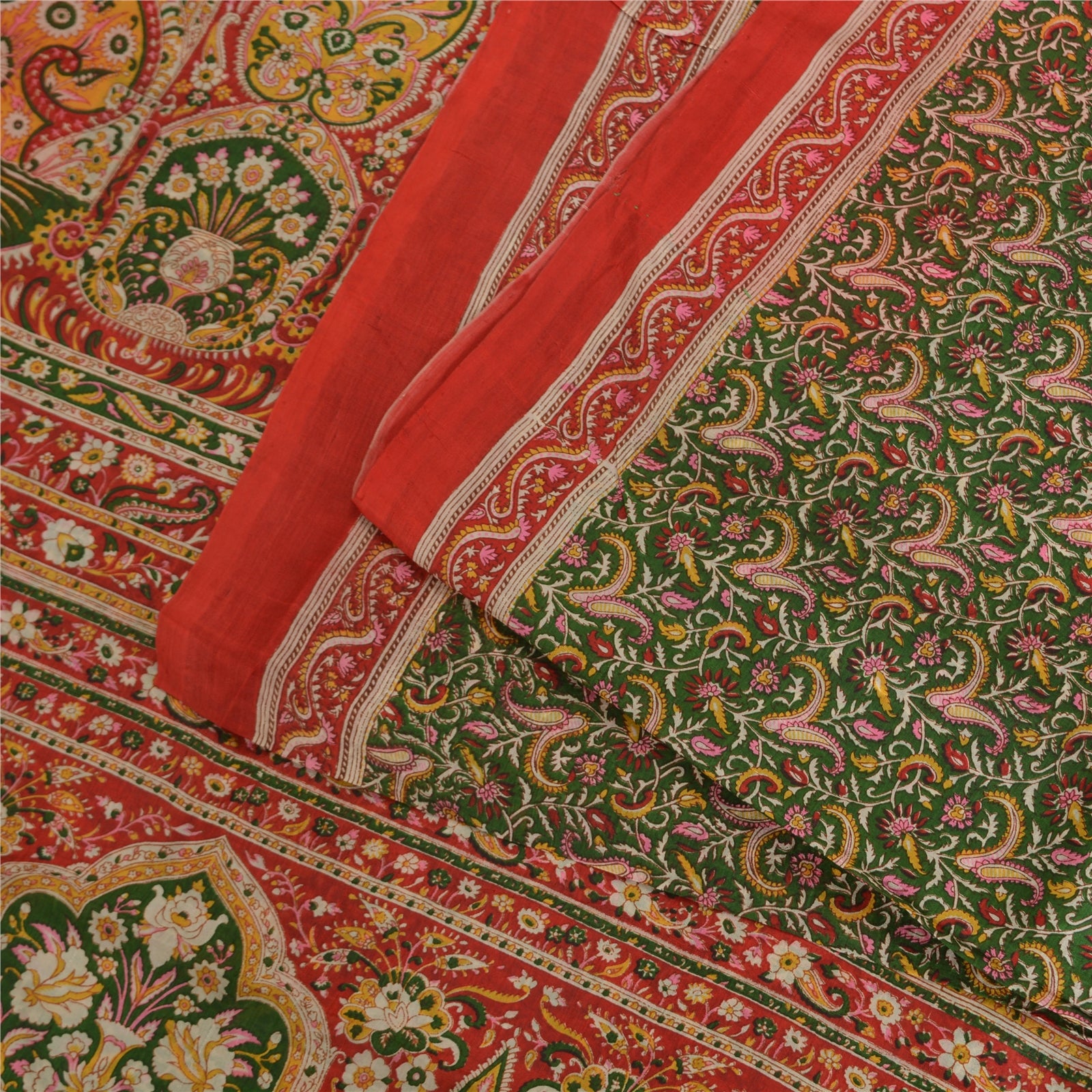 Sanskriti Vintage Sarees Green/Red Pure Silk Printed Sari Floral Craft Fabric
