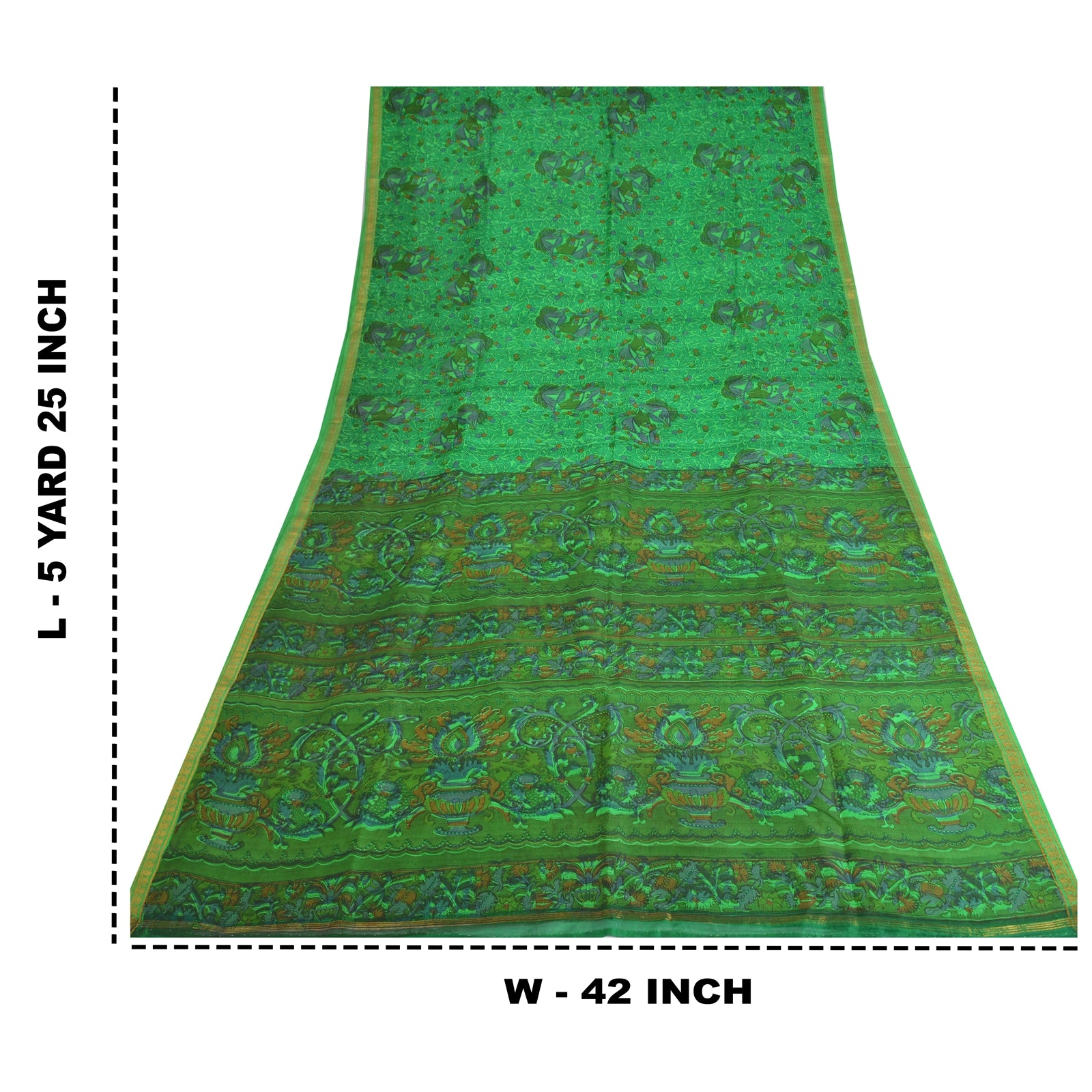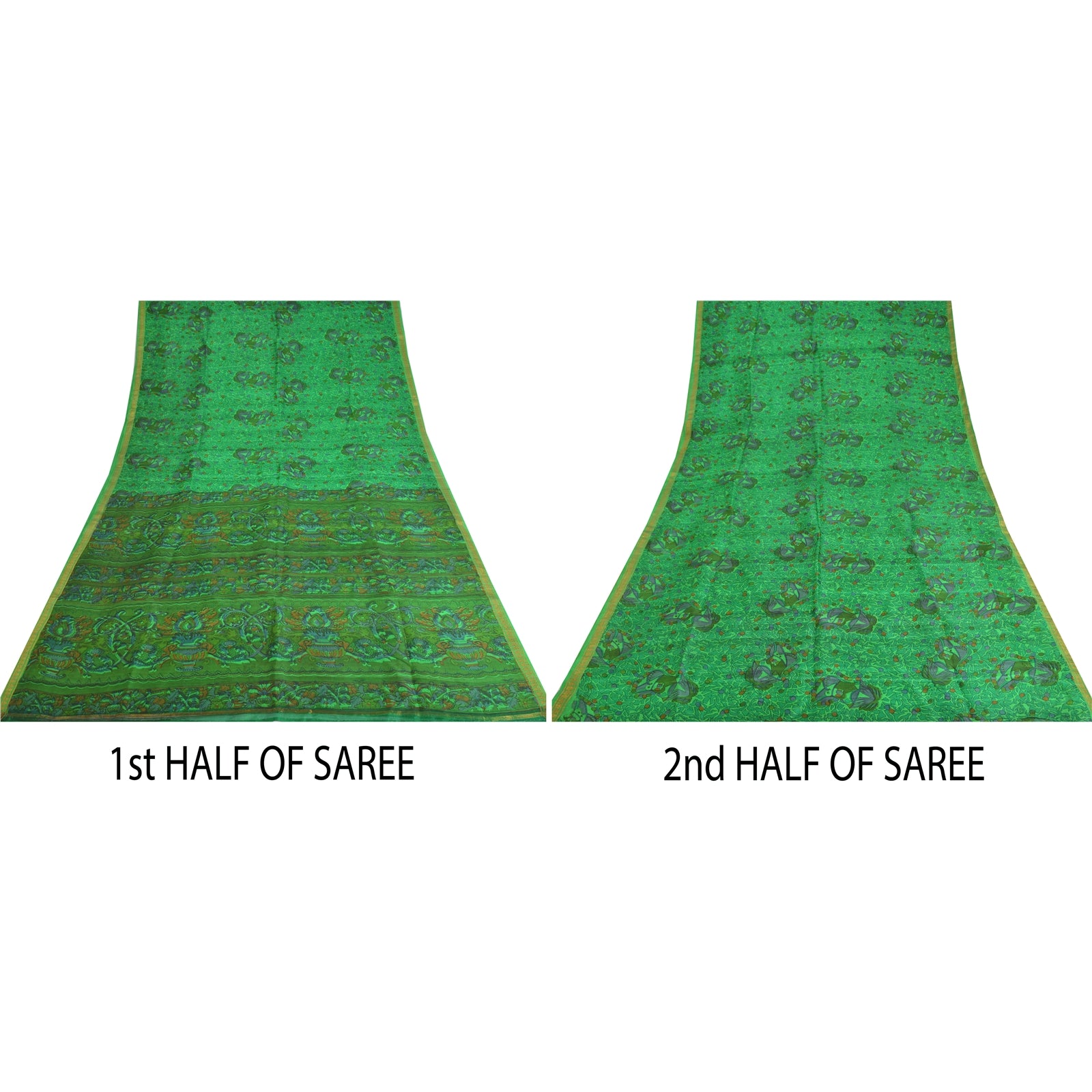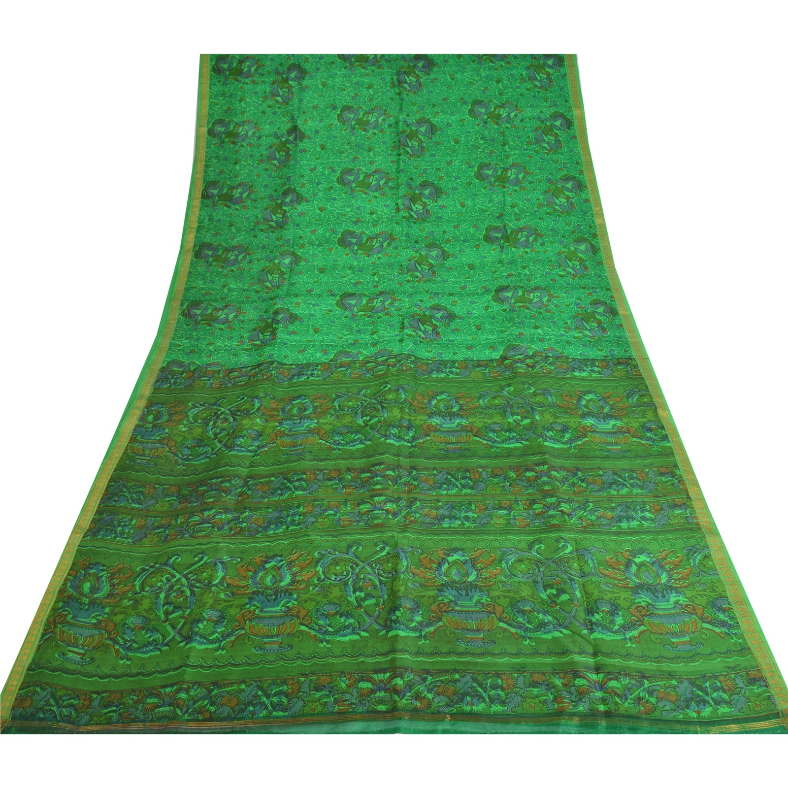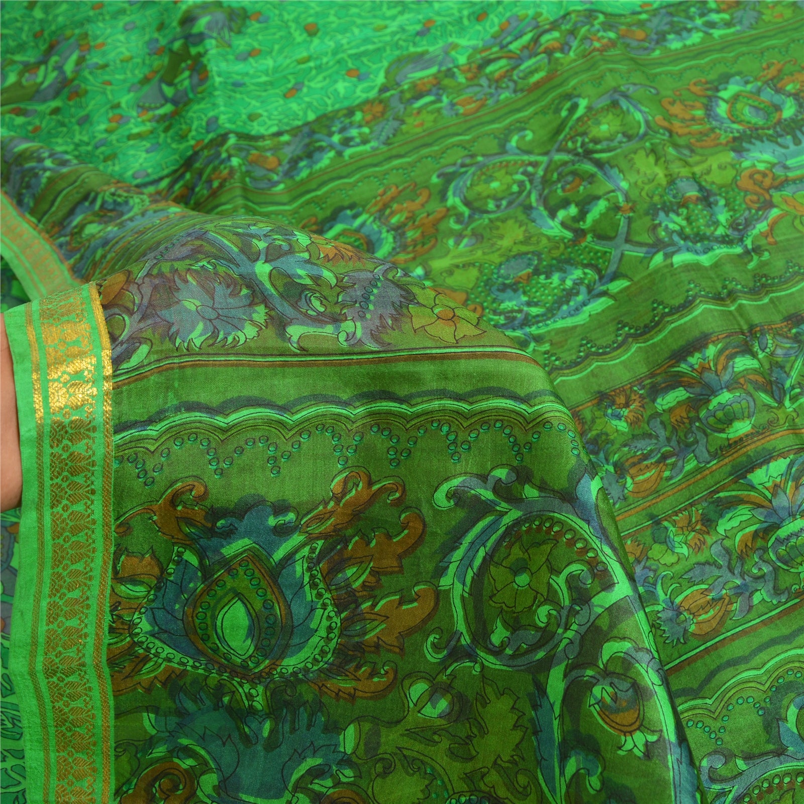 Санскритские винтажные сари зеленая кайма зари чистый шелк напечатанное сари ремесло устойчивая ткань