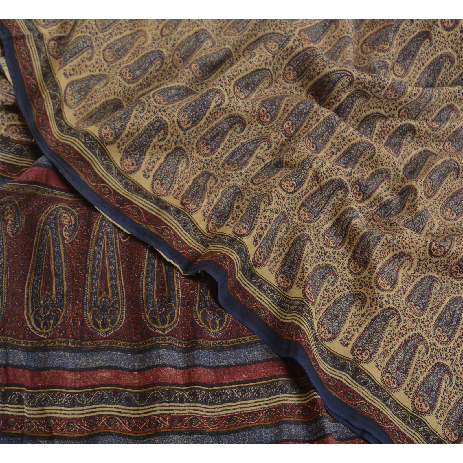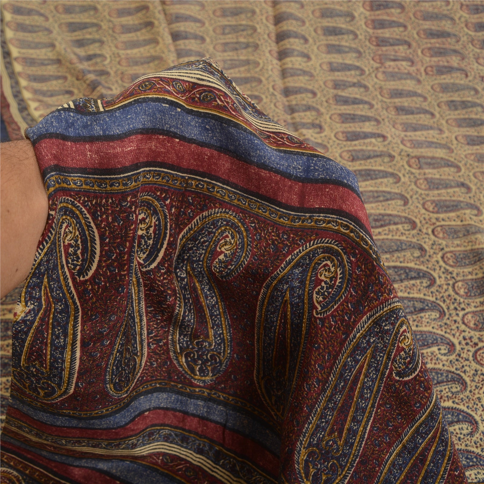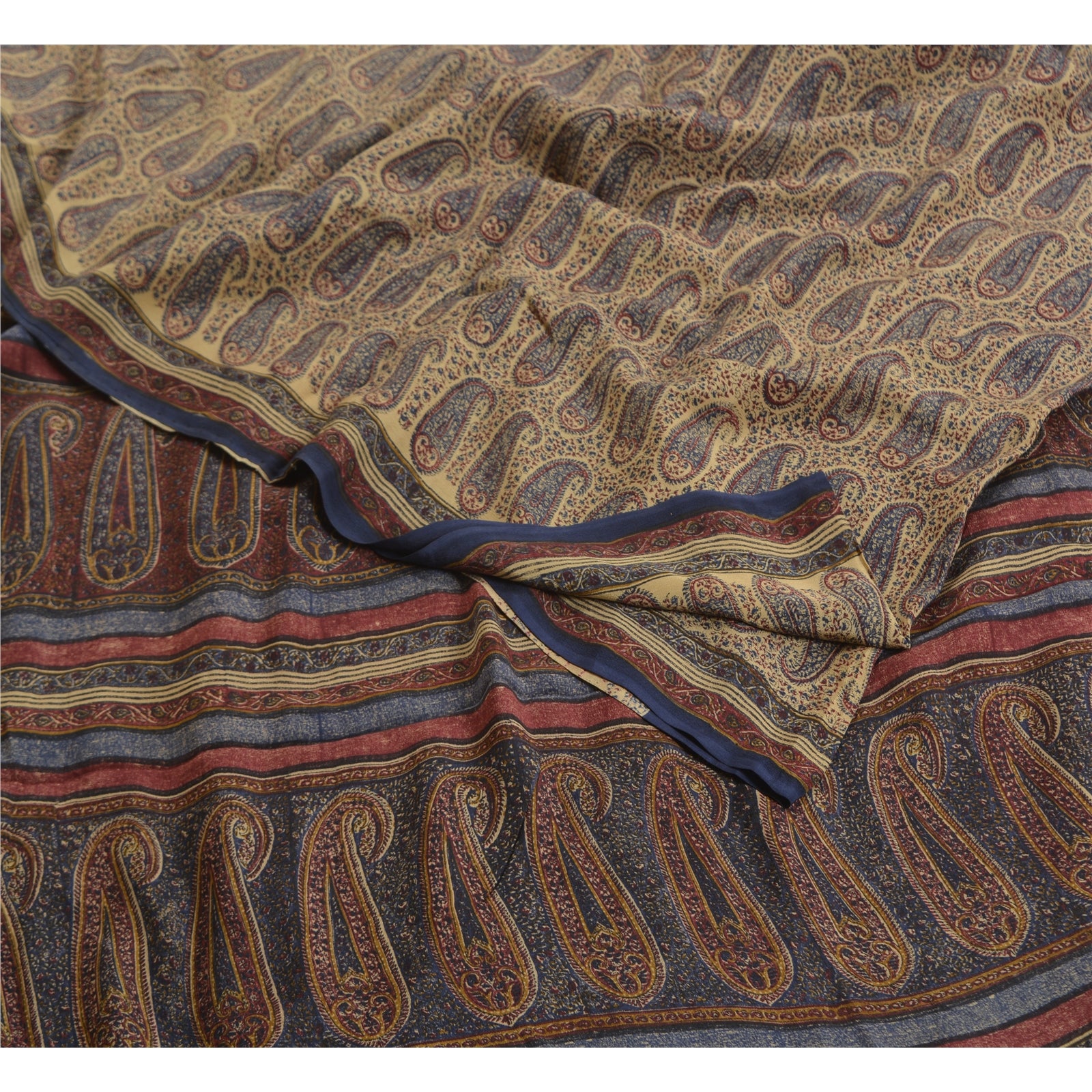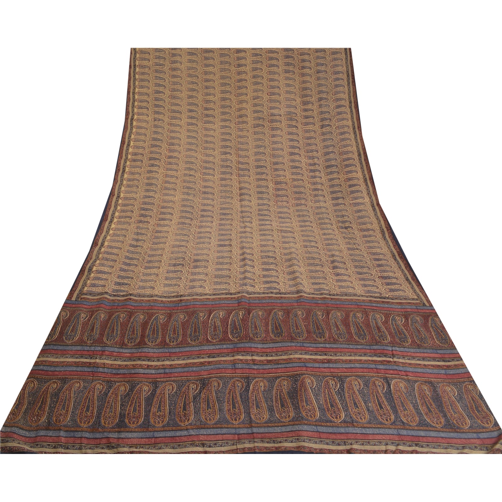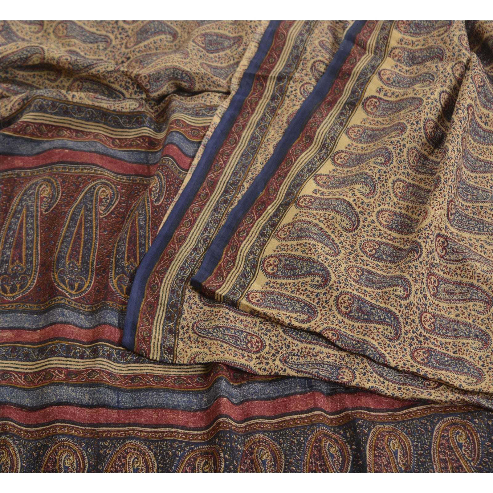 Санскритские винтажные сари индийский кремовый чистый креп шелк напечатанный сари ремесло устойчивая ткань