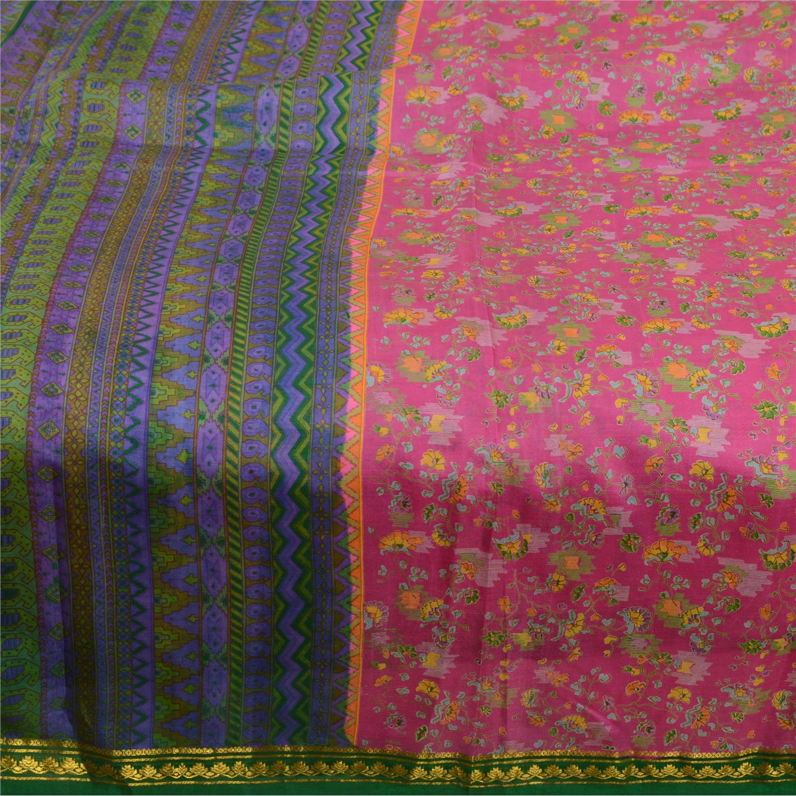 Sanskriti Vintage Sarees Pink Zari Border Pure Silk Printed Sari Craft Fabric