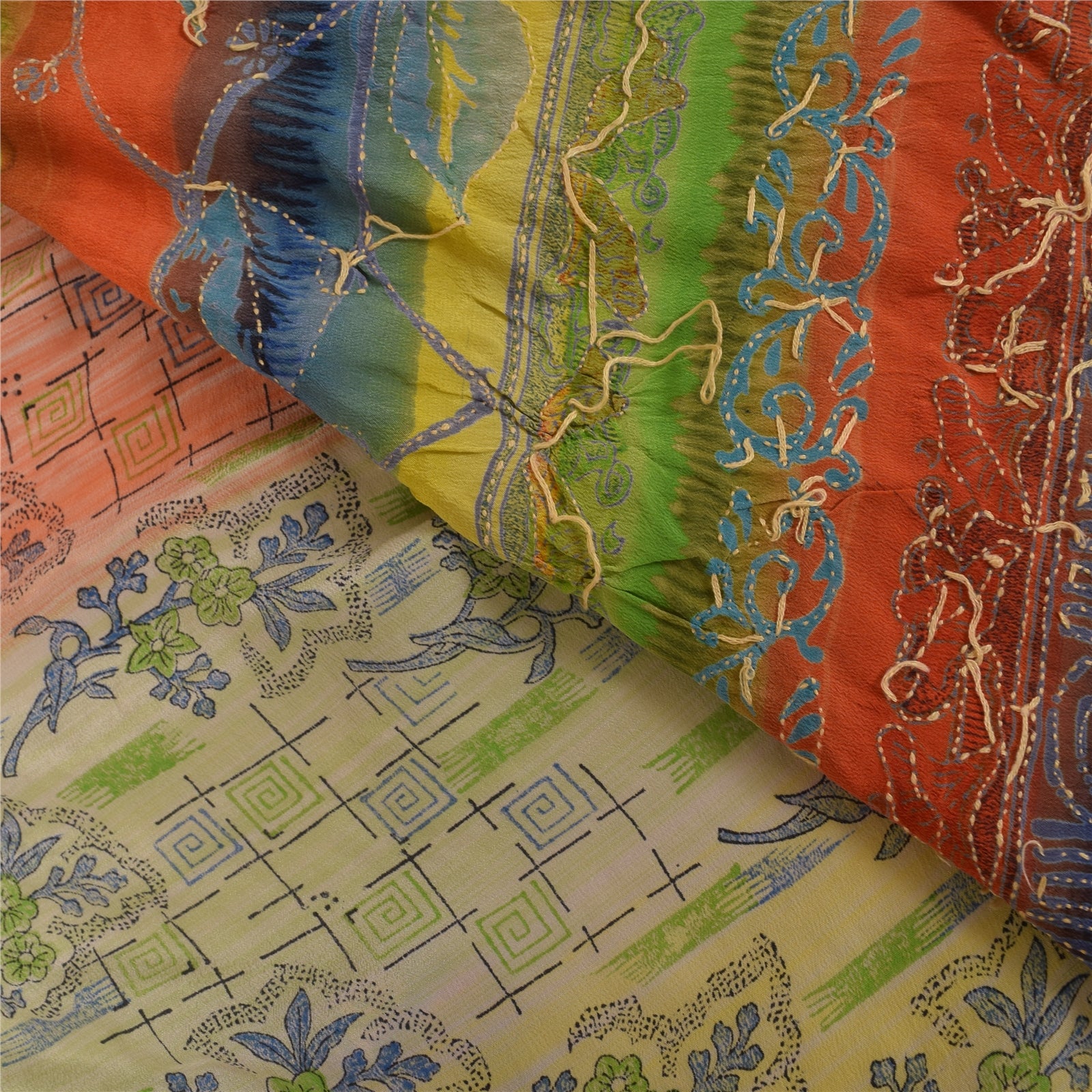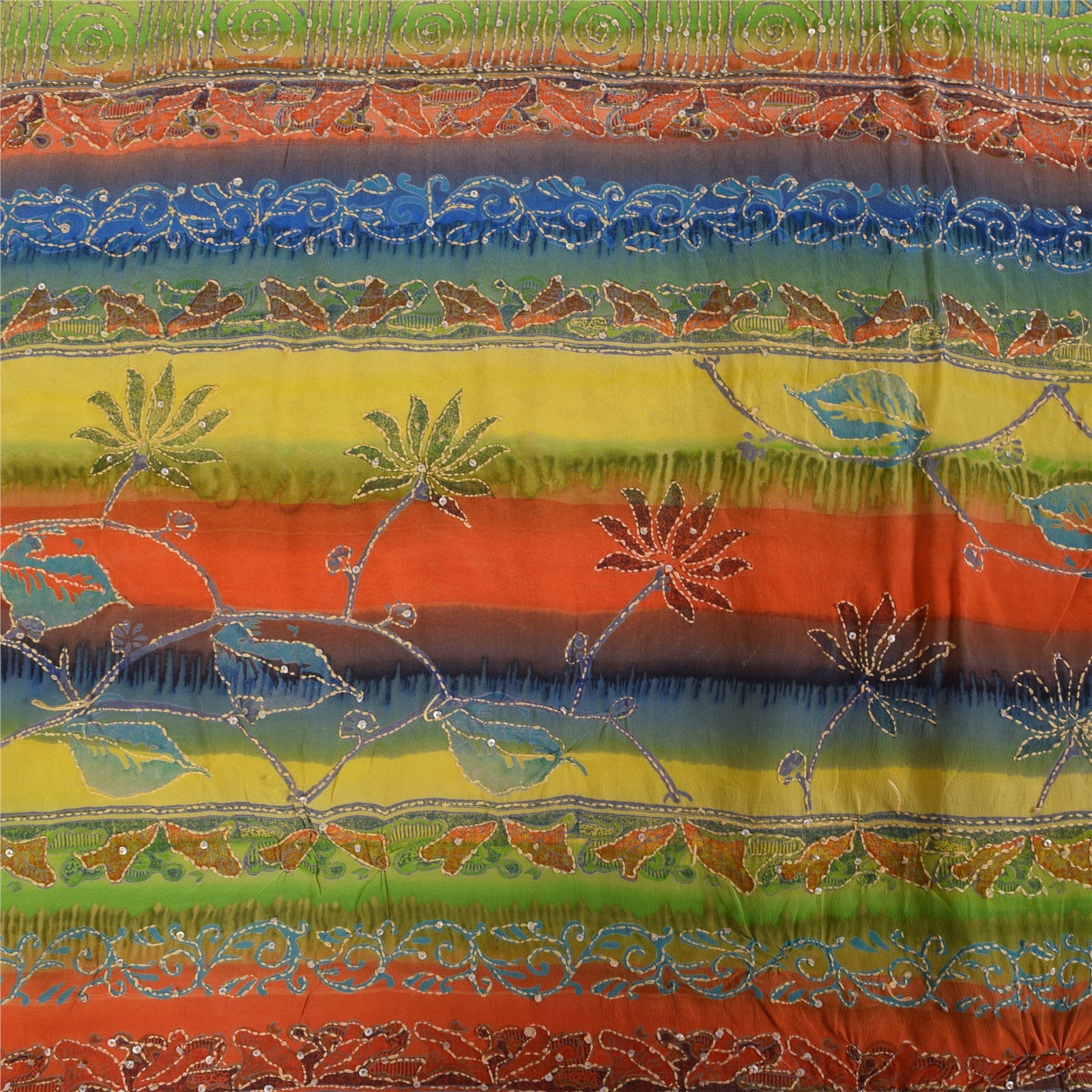 THE ITEM COLOR OR SHADE MAY BE DARKER OR LIGHTER THAN THE PICTURE.' • Beautiful multi colored hand embroidered 100% printed pure crepe silk kantha sari. • All over sari features floral design embellished with cream thread work, silver sequins work. Shining silver sequins work with floral design on multi color base fabric is really enhancing the beauty of the saree. This unique vintage saree can be used for various crafting ideas even if you don't want to use it as a sari. Design a dress, use it as a throw, as window dressing, upholstery, sarongs, table linen and much more. Let your creative juices flow and use this decorated fabric in multiple fashion. 'International buyers please note: Import duties, taxes, and charges are not included in the item price or postage cost. These charges are the buyer's responsibility. Please check with your country's customs office to determine what these additional costs will be prior to bidding or buying. Buyer will pay custom duty/tax. It is calculated and charged differently by every country. As a seller I do not have any control over it. VAT or sales tax is calculated by the platform at the time of checkout. Customs charge is payable at the time of delivery.' SKU: PS-38300