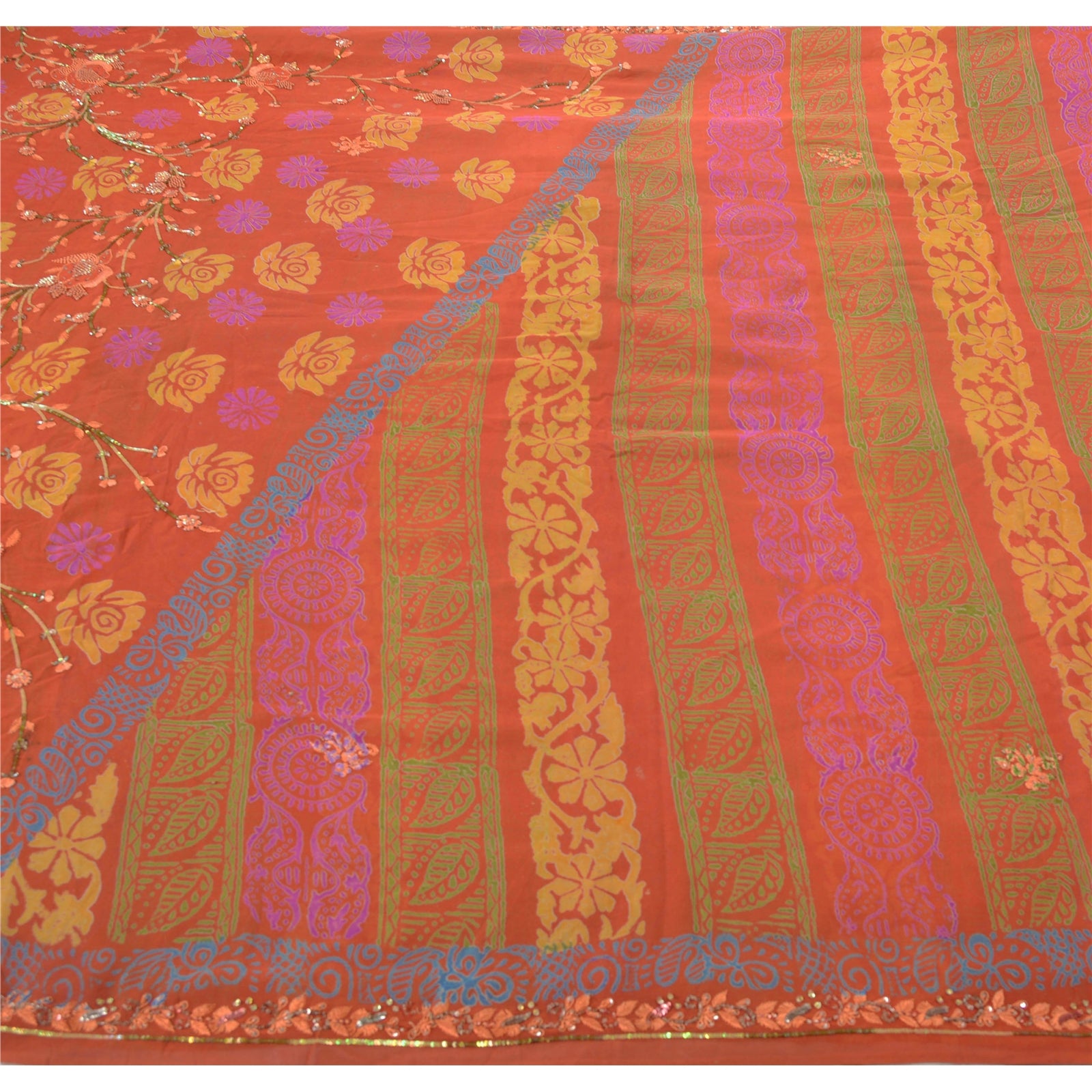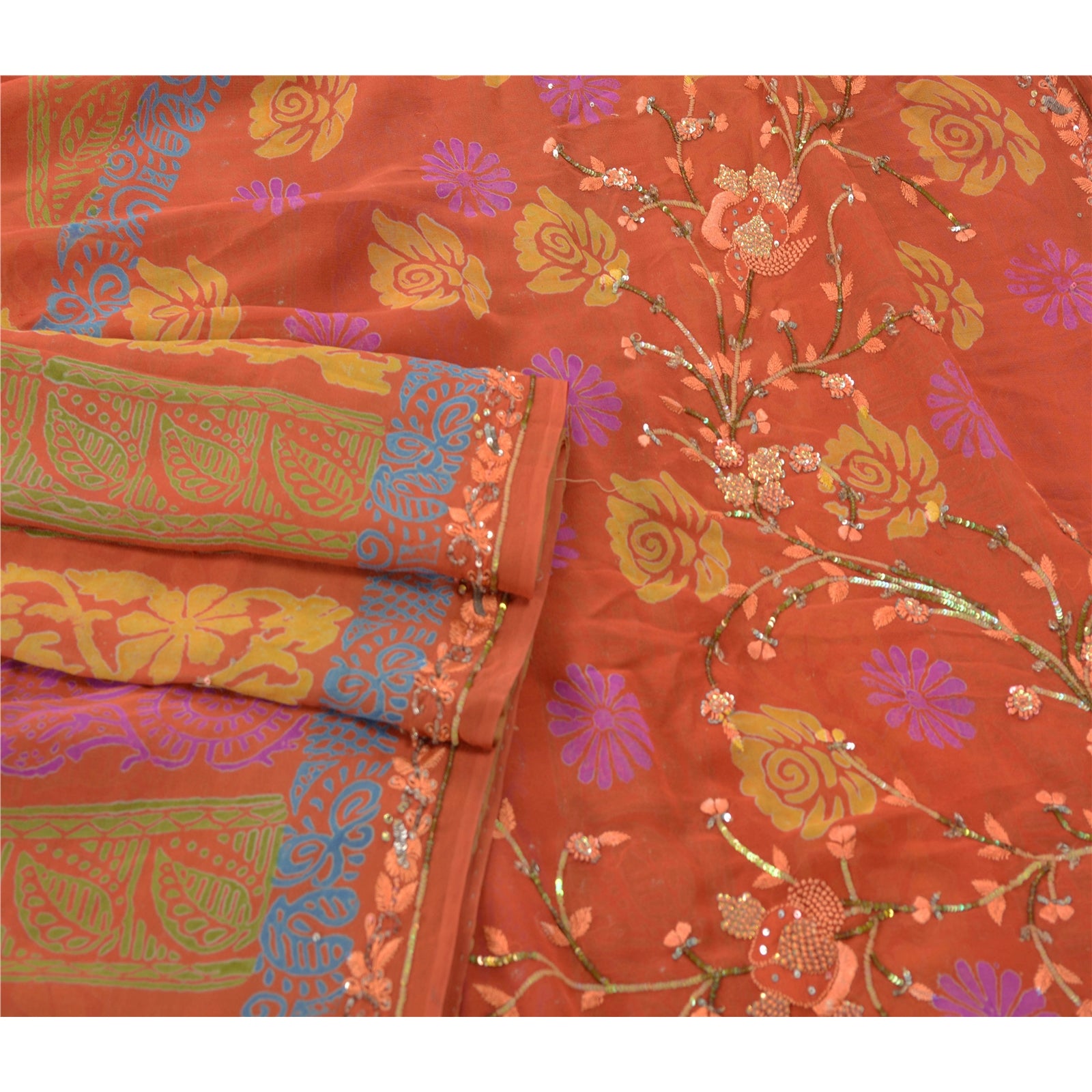 • Beautiful shade of peach colored 100% pure georgette silk hand embroidered printed sari. • Pallu & Border features printed floral & French knot design embroidered with peach thread work and embellished with green/peach sequins, white glass beads work. • Printed floral design in center part of saree. What is special about this saree? Sparkling sequins work with floral print is really enhancing the beauty of the saree. This unique vintage saree can be used for various crafting ideas even if you don't want to use it as a sari. Design a dress, use it as a throw, as window dressing, upholstery, sarongs, table linen and much more. Let your creative juices flow and use this decorated fabric in multiple fashion.