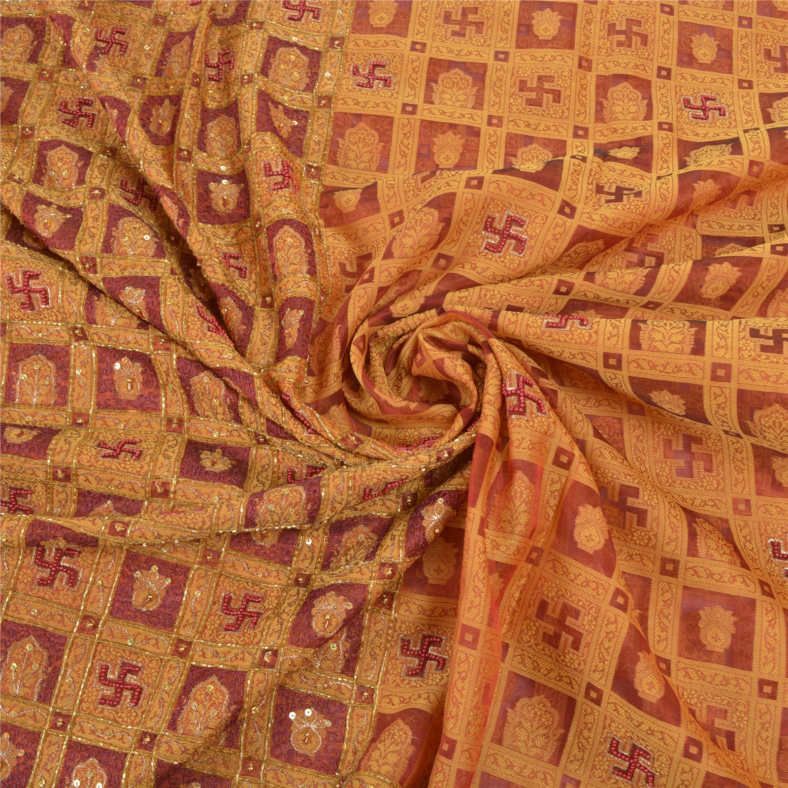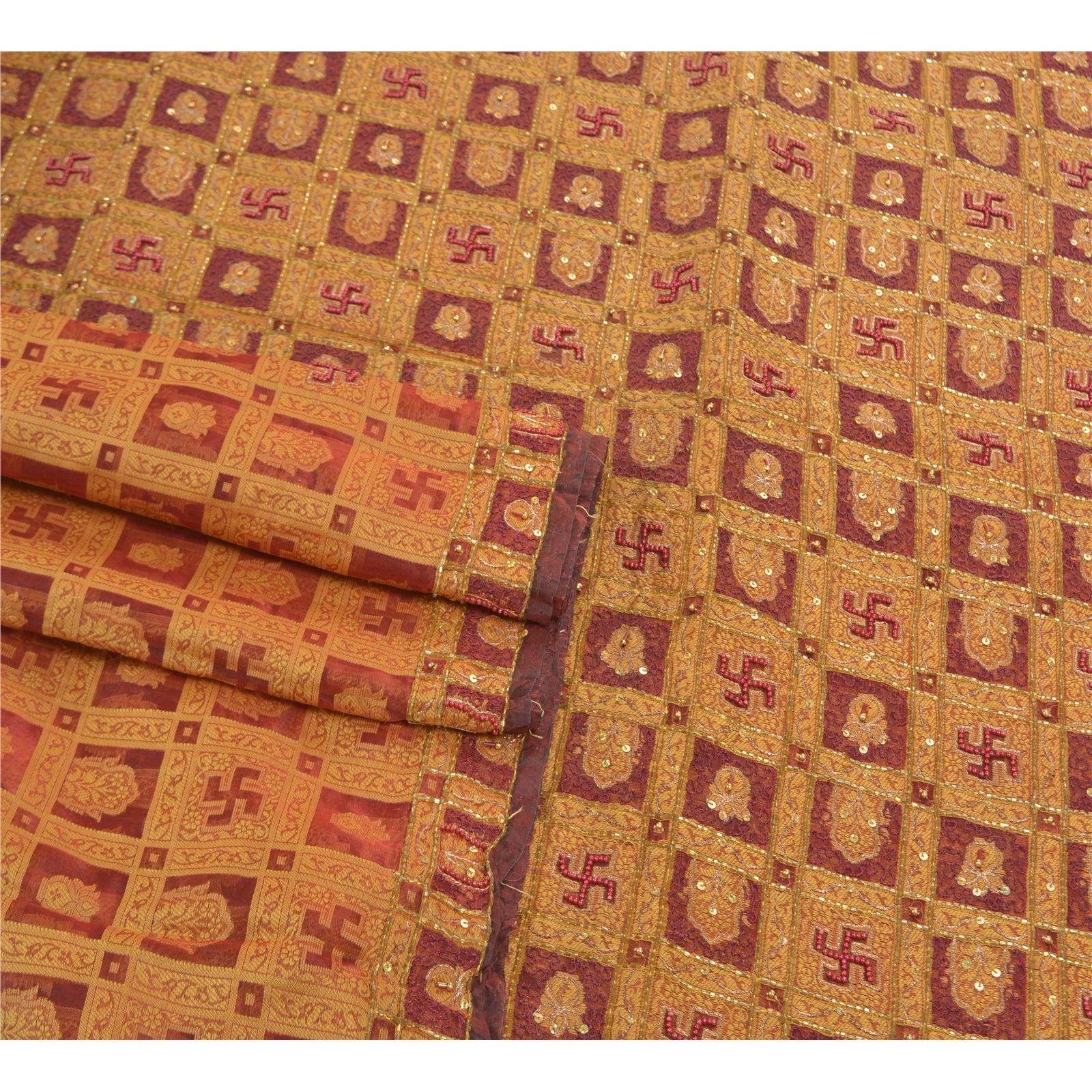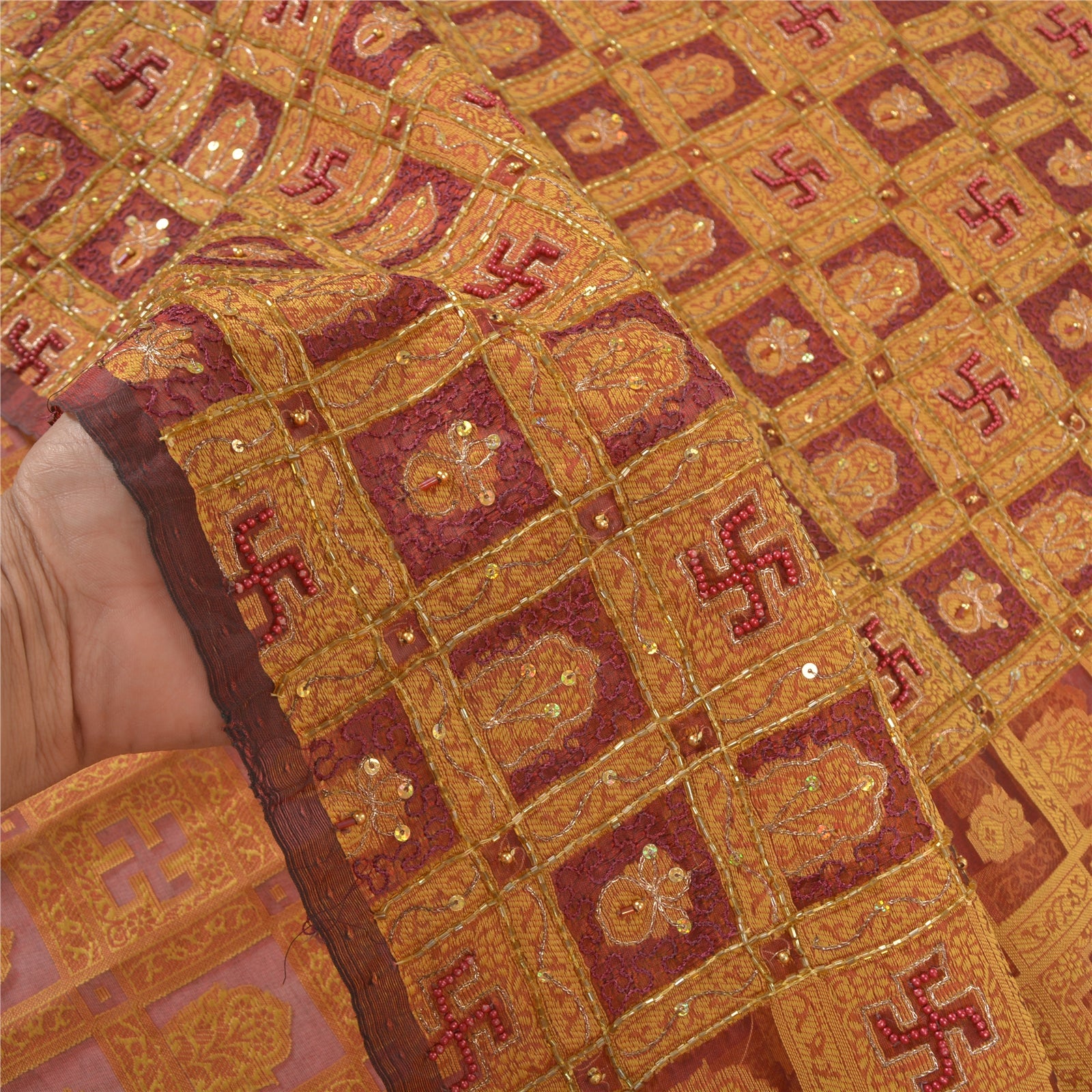 Красивое темно-красное сари из 100% чистого шелка органзы, вышитое вручную и сотканное вручную. Pallu & Border отличается цветочным дизайном, глиняным горшком с кремовым плетением, украшенным бордовыми бусинами, похожими на жемчуг, золотыми зари, золотыми пайетками. Вы можете увидеть подобную плетеную и бисерную работу с цветочным узором в центральной части сари. Это сари также можно использовать для различных идей по рукоделию. Используйте его для дизайна платья, в качестве пледа, в качестве украшения окон, обивки, столового белья и многого другого. Дайте волю своим творческим сокам.