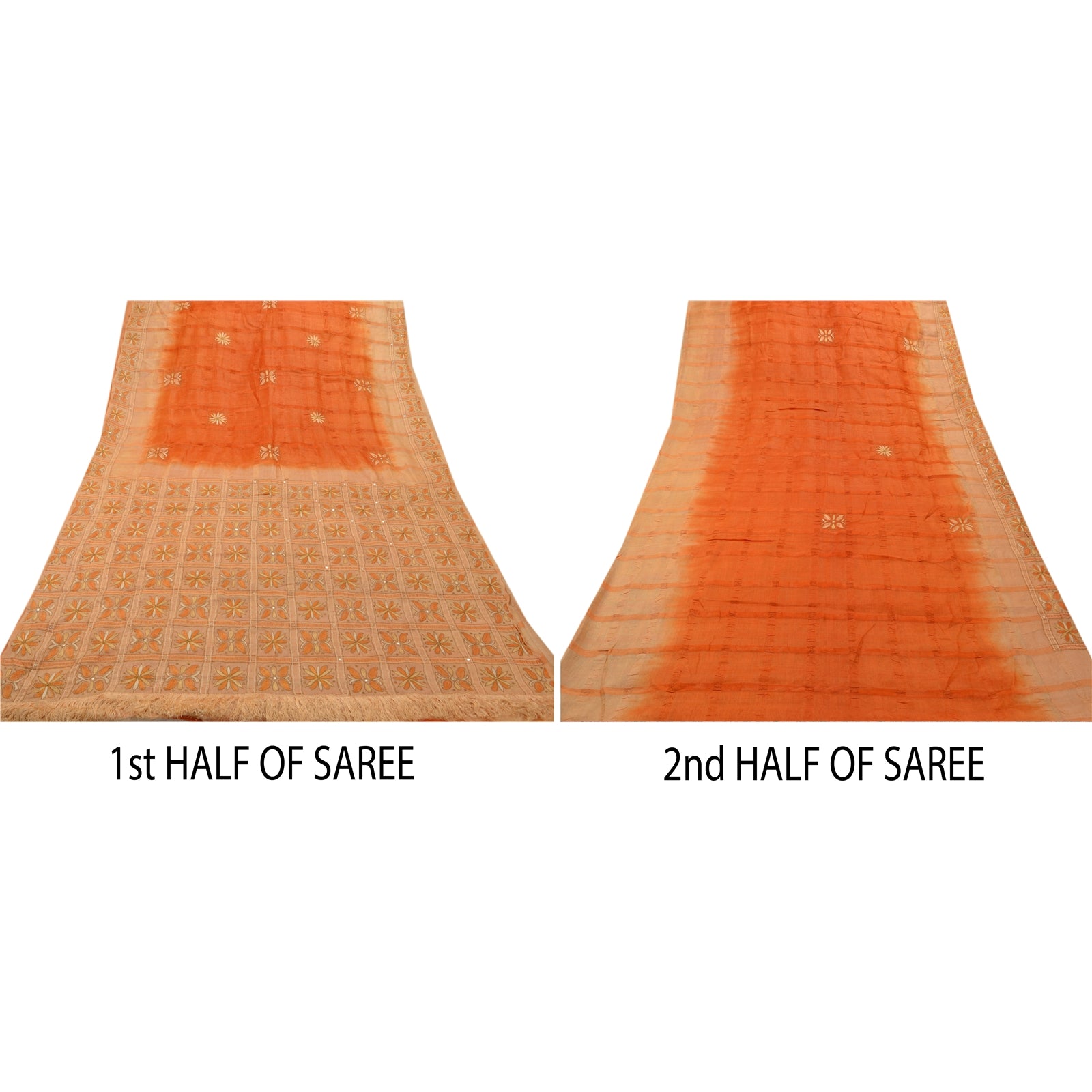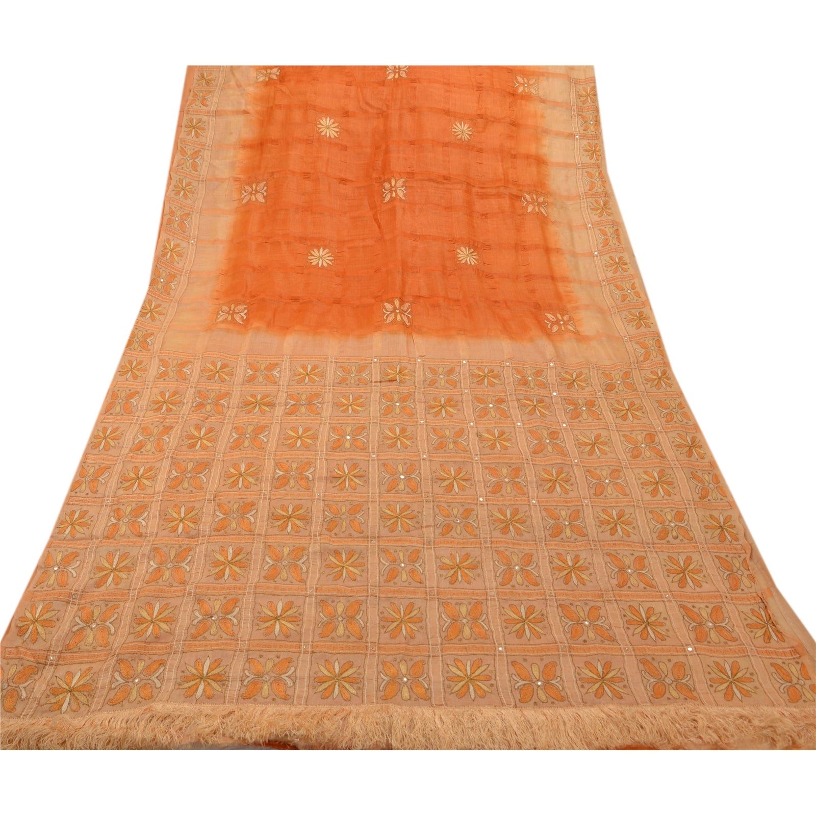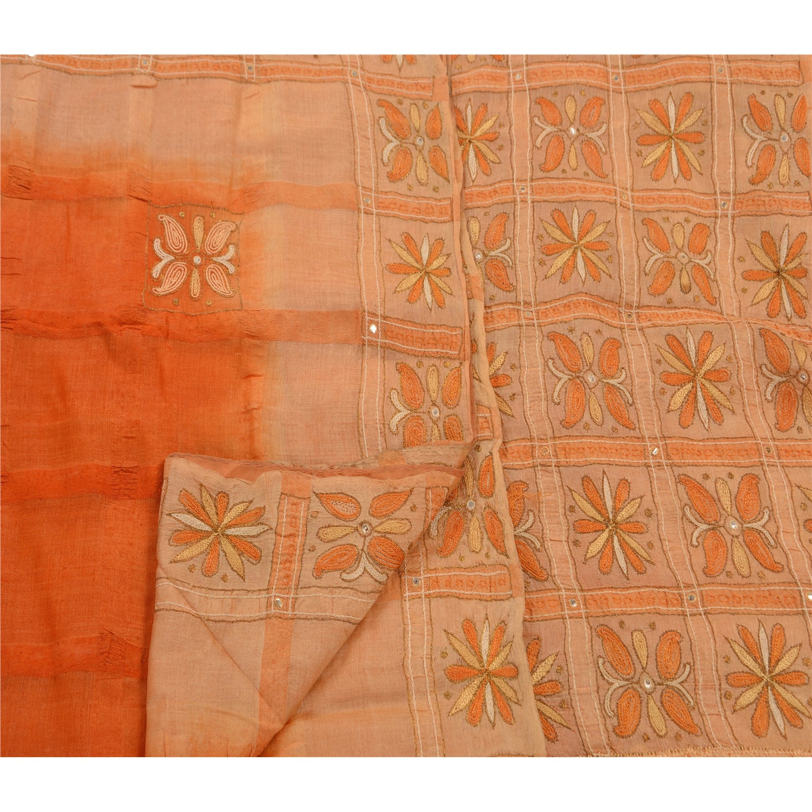 • Beautiful orange & peach colored hand embroidered pure silk sari • Pallu & Border features floral design embellished with gold zari work, cream, saffron thread work and mirror work. • Sari has cream fringes on pallu. • There are floral motifs with similar work in center part of sari. What is special about this saree? The gold zari work with floral design on orange & peach base fabric is really enhancing the beauty of the saree. This unique vintage saree can be used for various crafting ideas even if you don't want to use it as a sari. Design a dress, use it as a throw, as window dressing, upholstery, sarongs, table linen and much more. Let your creative juices flow and use this decorated fabric in multiple fashion.