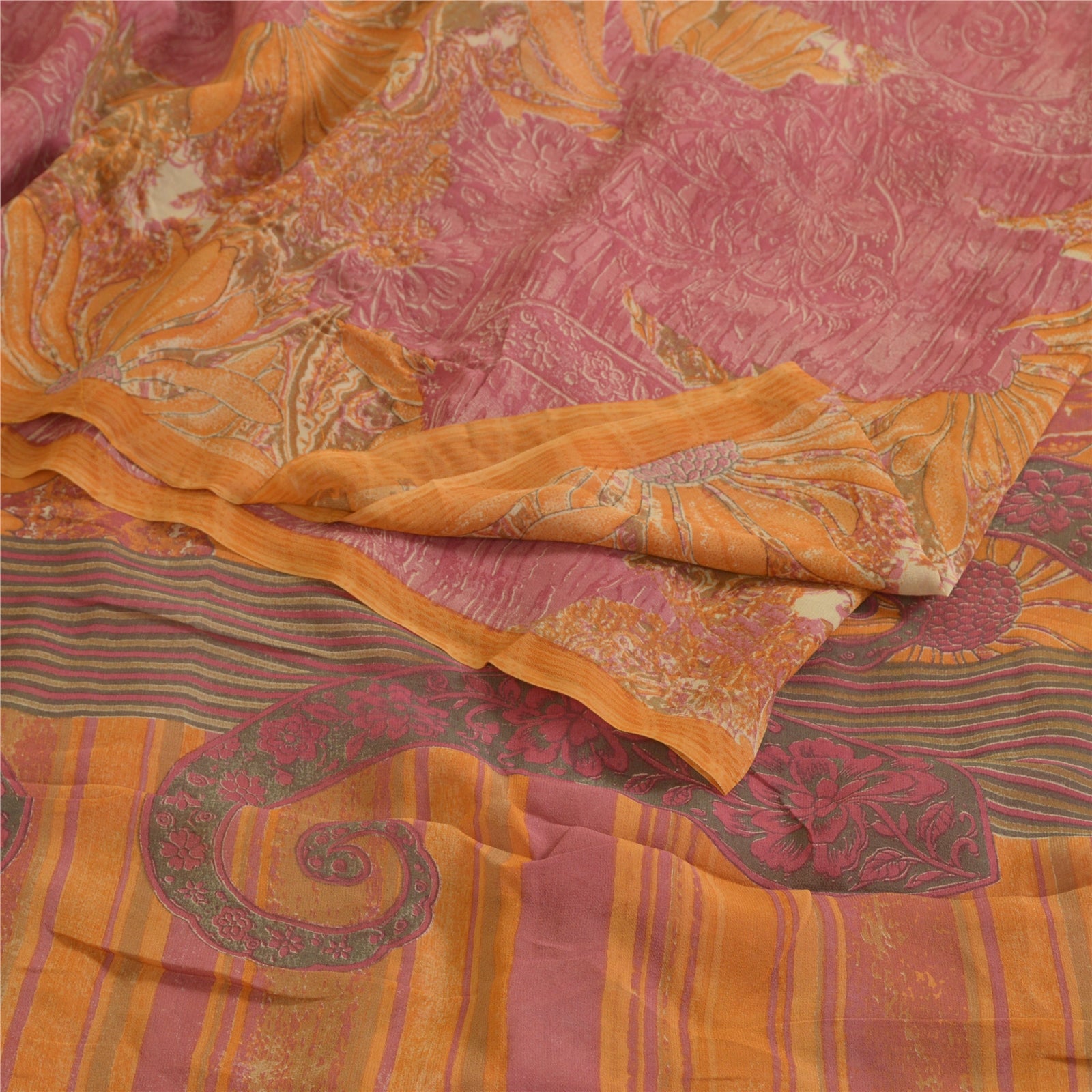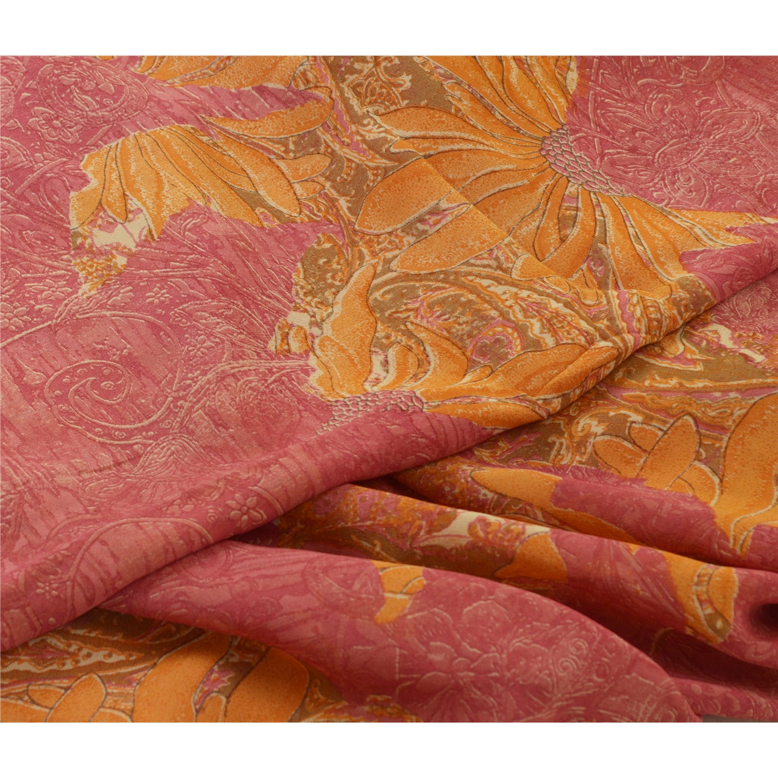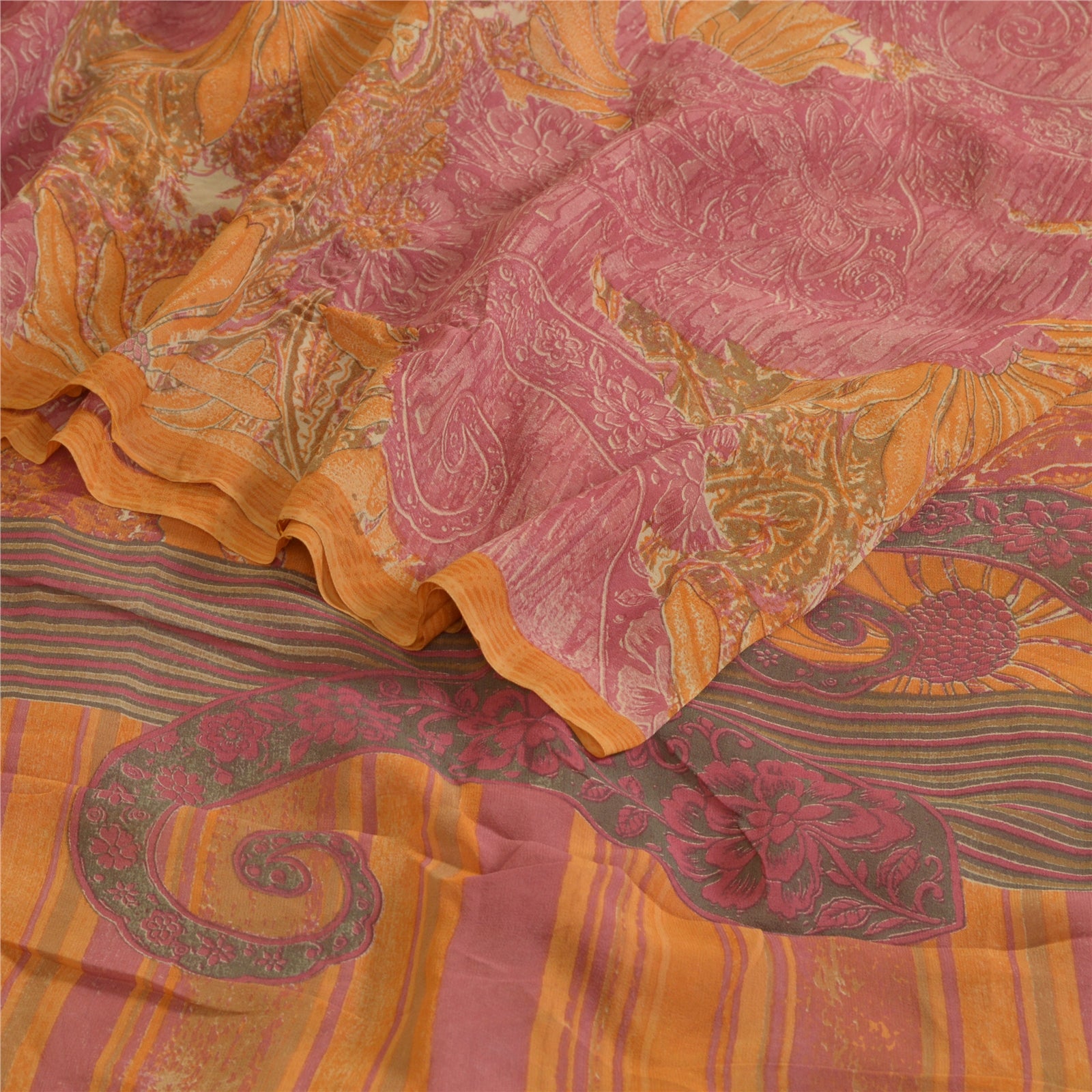 Сари Санскрити Винтаж Шафран/Розовый Чистый Жоржет Шелк Печатный Сари Экологичная Ткань