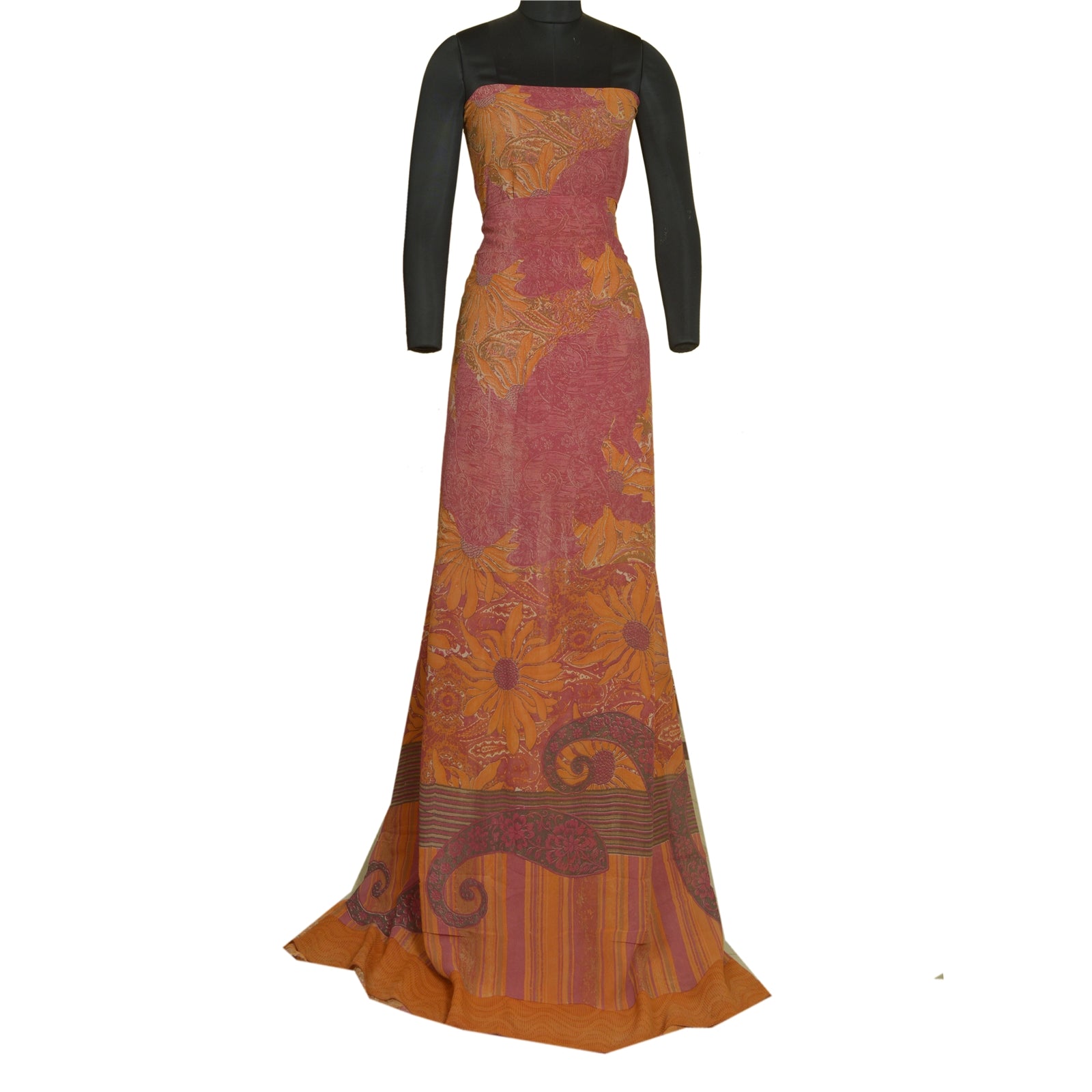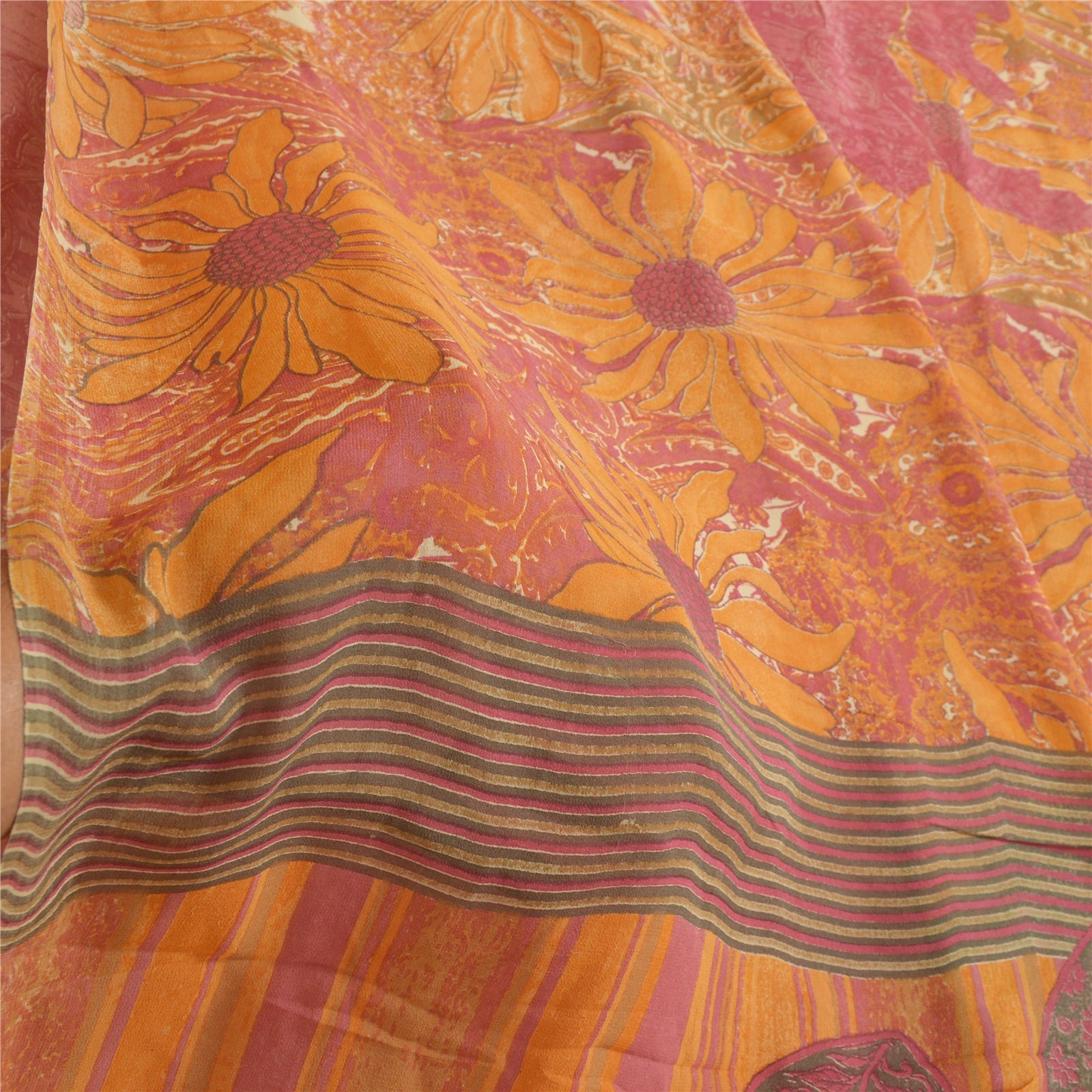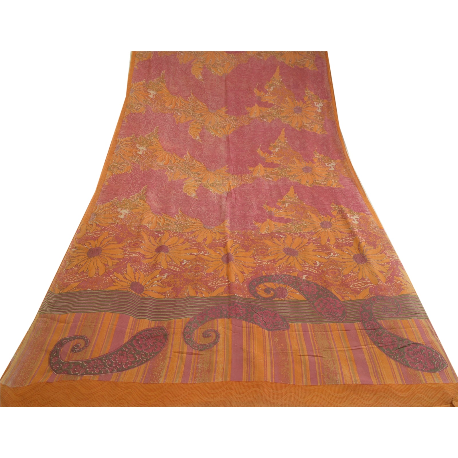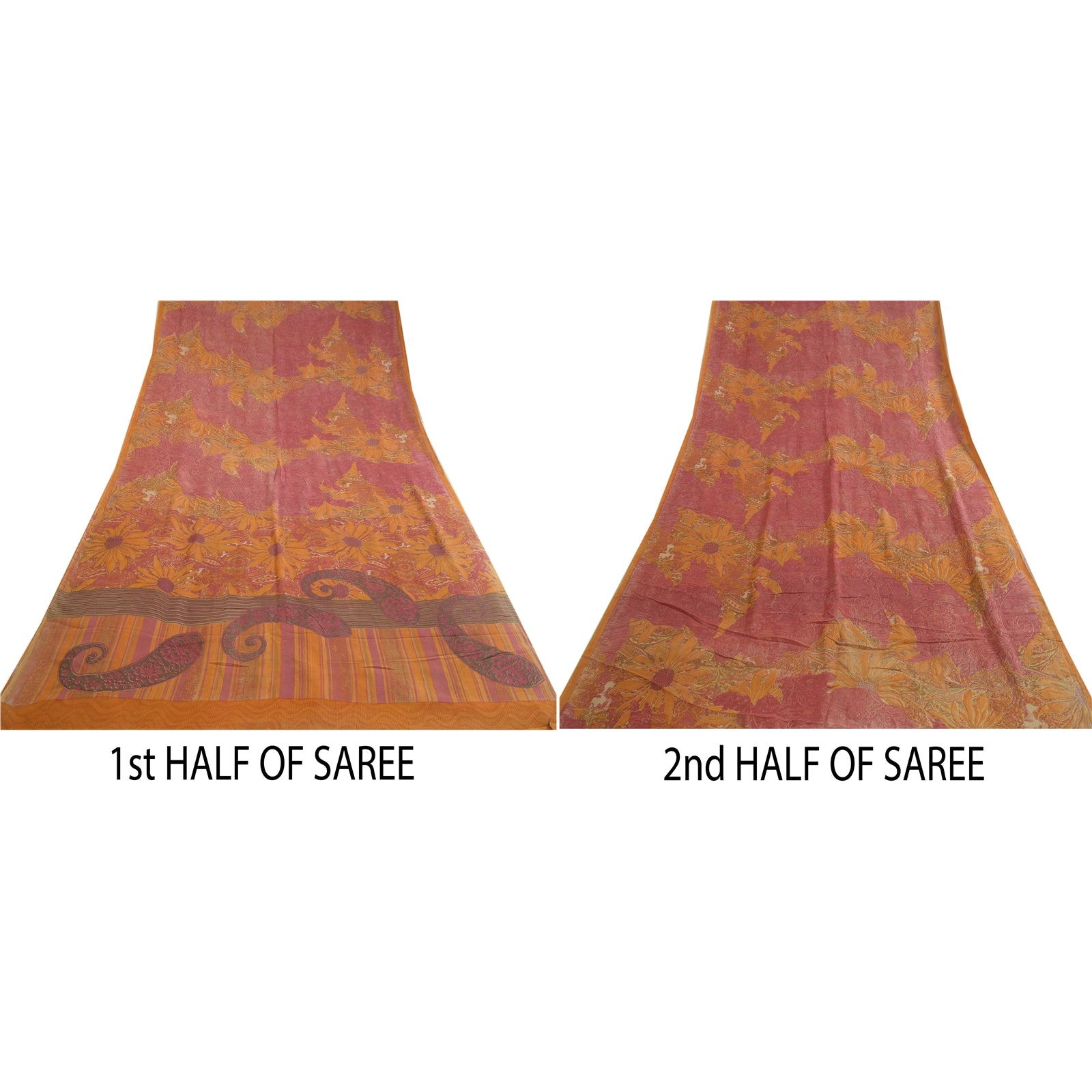 ЦВЕТ ИЛИ ОТТЕНОК ИЗДЕЛИЯ МОГУТ БЫТЬ ТЕМНЕЕ ИЛИ СВЕТЛЕЕ, ЧЕМ НА ИЗОБРАЖЕНИИ. Красивое сари из чистого шелка-жоржета шафранового и розового цвета с принтом. Паллу и кайма с напечатанным цветочным узором. Цветочный узор в центральной части сари. На сари есть легкие пятна. Что особенного в этом сари? Яркий дизайн на мягкой устойчивой ткани действительно подчеркивает красоту сари. Это уникальное винтажное сари можно использовать для различных идей по рукоделию, даже если вы не хотите использовать его как сари. Спроектируйте платье, используйте его в качестве украшения витрин, обивки, саронгов, пледов, для пошива платьев и столового белья и многого другого. Дайте волю своим творческим сокам и используйте эту декорированную устойчивую ткань в различных модах. Международные покупатели, пожалуйста, обратите внимание: импортные пошлины, налоги и сборы не включены в цену товара или стоимость почтовых расходов. Эти расходы являются ответственностью покупателя. Пожалуйста, свяжитесь с таможенной службой вашей страны, чтобы определить, какими будут эти дополнительные расходы, до торгов или покупки. Покупатель будет платить таможенную пошлину/налог. Она рассчитывается и взимается по-разному в каждой стране. Как продавец, я не имею никакого контроля над ней. НДС или налог с продаж рассчитывается платформой во время оформления заказа. Таможенный сбор подлежит уплате во время доставки.