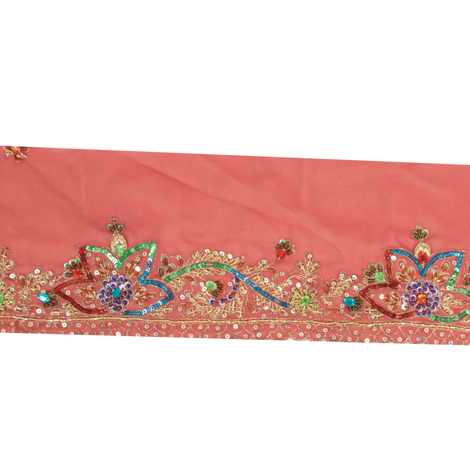 Beautiful georgette hand embroidered sari border. Further embellished by gold zari/dabka work, gold/red zardozi work, red thread work. Also, you can see gold/blue/green/silver designing sequins, red/green glass beads, blue/red stone work along with floral design on peach base fabric. 1 Quantity = 1 Yard Versatile Uses-Dress Designing, Crafting Projects & Decor. THE ITEM COLOR OR SHADE MAY BE DARKER OR LIGHTER THAN THE PICTURE.' International buyers please note: Import duties, taxes, and charges are not included in the item price or postage cost. Buyer will pay custom duty/tax,VAT, and any applicable charges at the time of delivery. B-9515