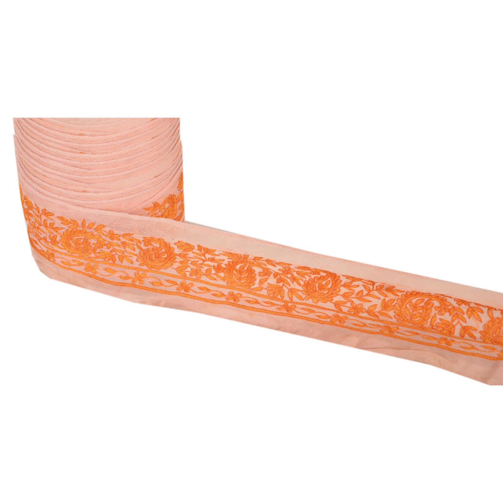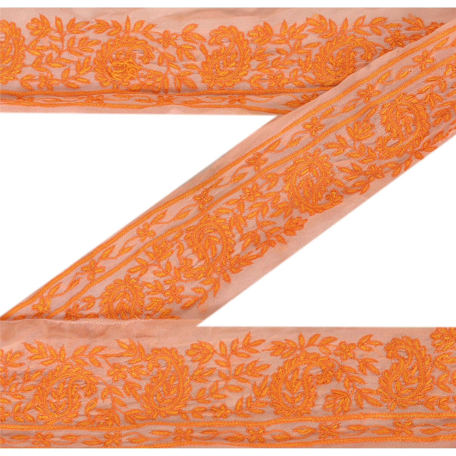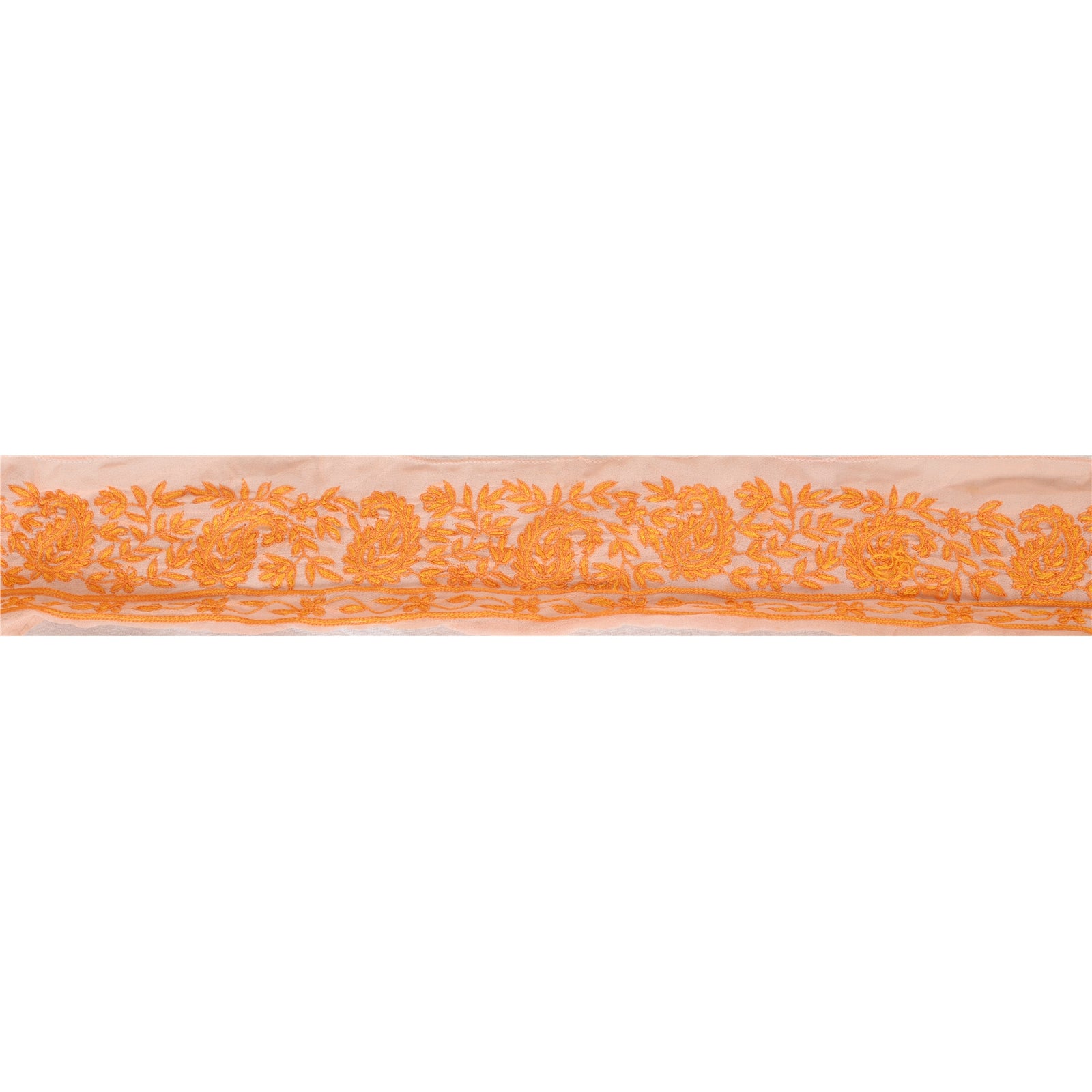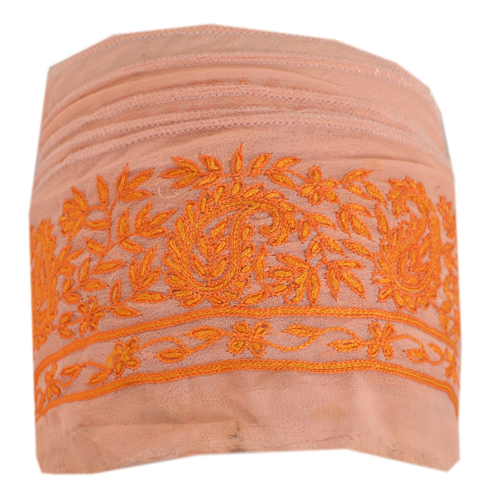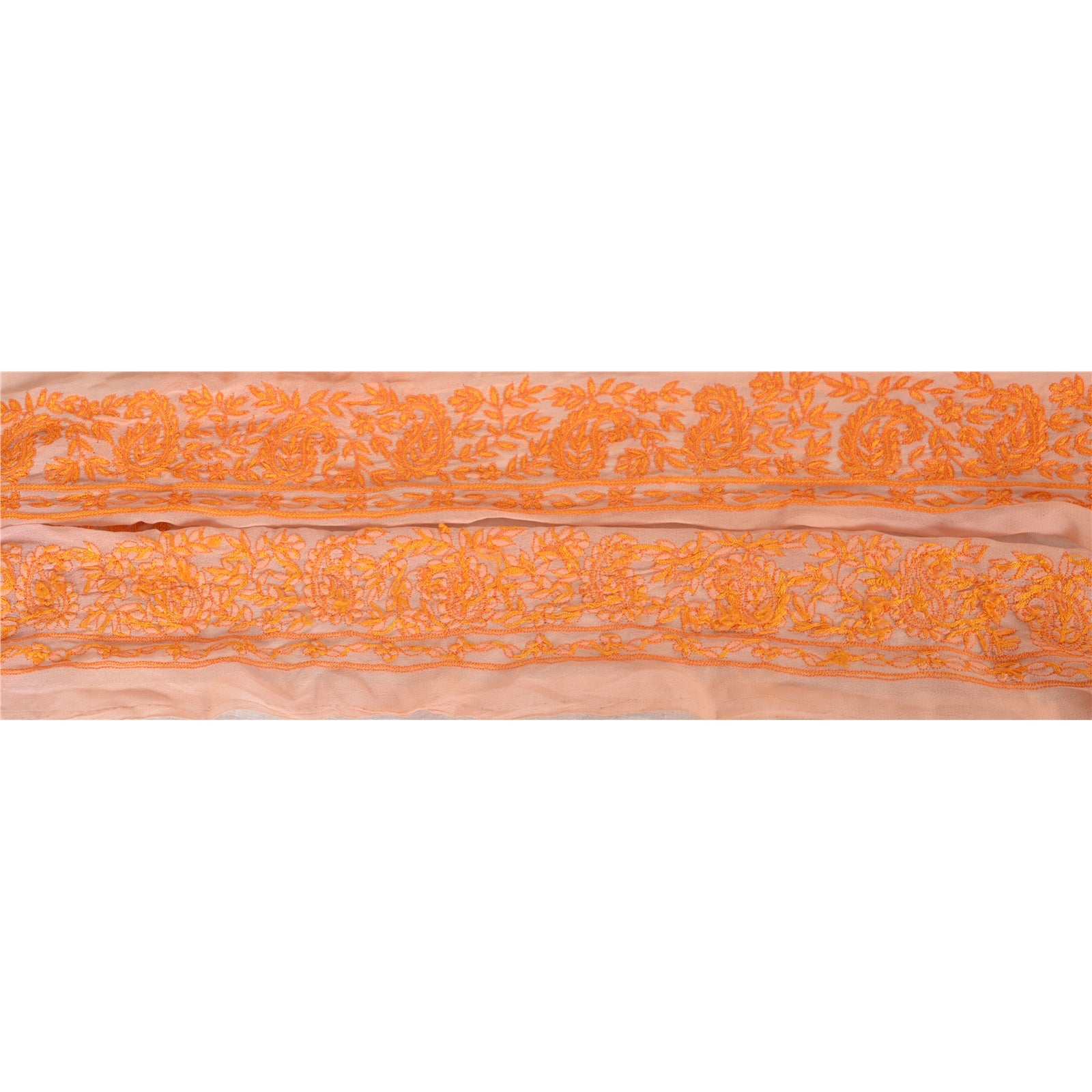 Потрясающая вышитая вручную кайма сари из жоржета персикового цвета с акцентными нитями. Бордюр украшен красивыми цветочными и пейсли-узорами, кропотливо вышитыми вручную оранжевыми нитками. ВАУ!! потрясающий, уникальный и универсальный бордюр. 1 Количество = 1 Ярд