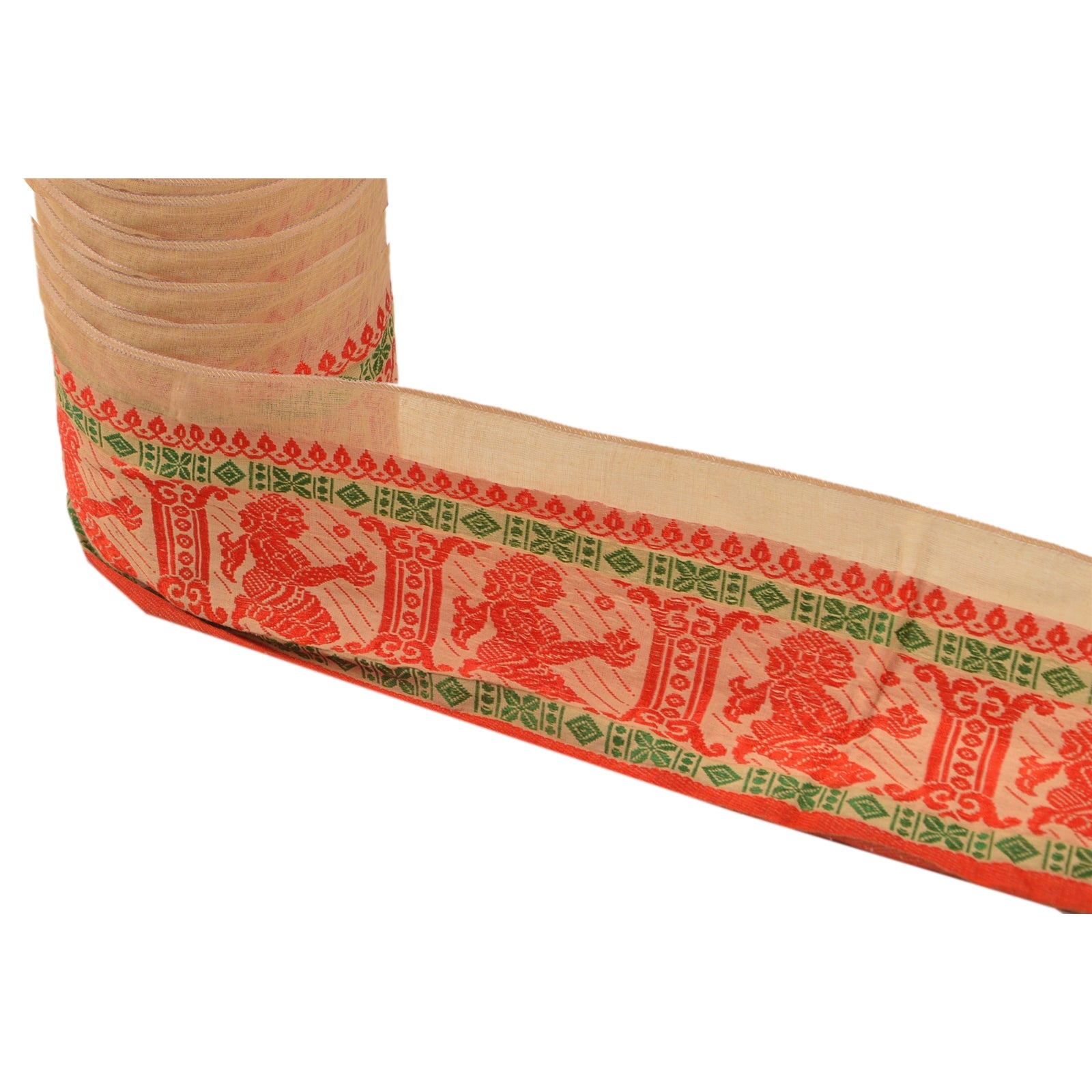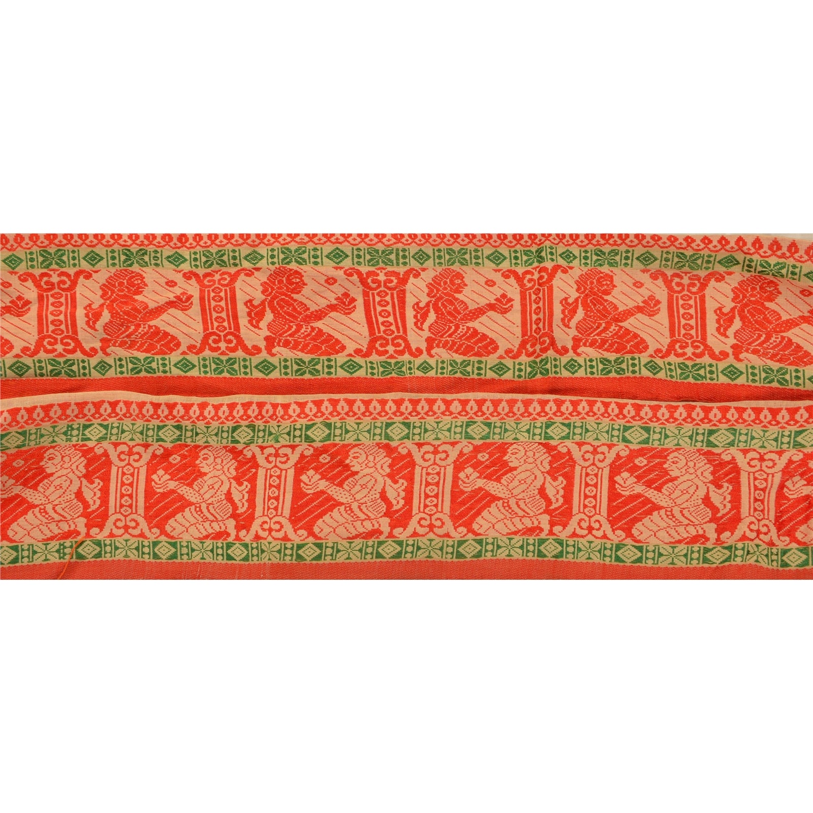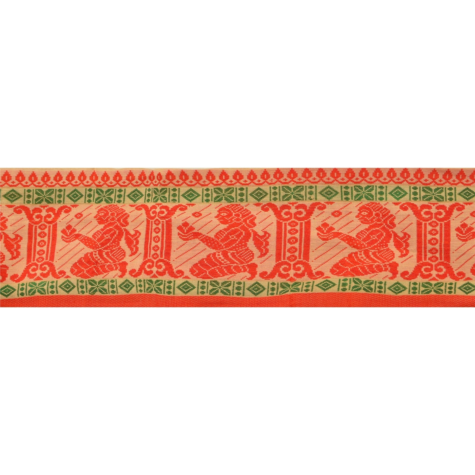 Удивительная хлопковая тканая кайма сари кремового цвета, подчеркивающая традиционную работу балучари из Одиши (Восточная Индия). Кайма имеет красивый тканый узор оранжевого и зеленого цветов, изображающий сидящую женщину с цветком. Цветочные мотивы еще больше дополняют красоту отделки. ВАУ!! и потрясающая, единственная в своем роде, универсальная кайма. 1 количество = 1 ярд