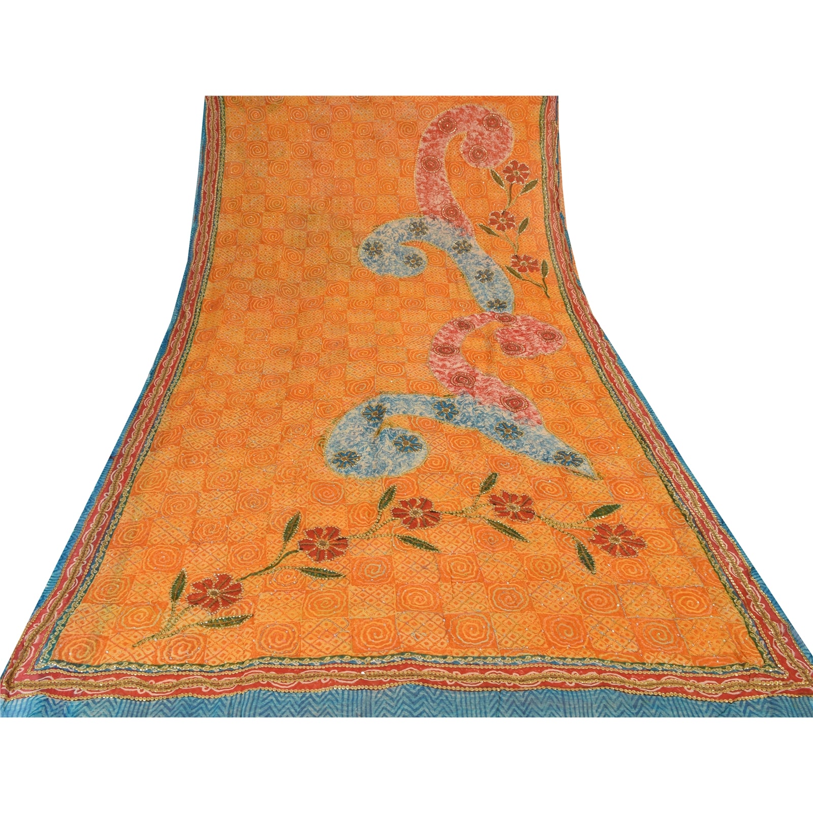 THE ITEM COLOR OR SHADE MAY BE DARKER OR LIGHTER THAN THE PICTURE.' • Awesome shade of yellow colored hand embroidered printed pure georgette silk kantha sari. • Pallu & Border features floral design embellished with multi color thread work, golden/silver sequins work & blue & red color printed work. • There are floral motifs with similar work in center part of sari. Shining golden/silver sequins work with vibrant printed work on yellow color base fabric is really enhancing the beauty of the saree. This unique vintage saree can be used for various crafting ideas even if you don't want to use it as a sari. Design a dress, use it as a throw, as window dressing, upholstery, sarongs, table linen and much more. Let your creative juices flow and use this decorated fabric in multiple fashion. Shipping note: International buyers please note: Import duties, taxes, and charges are not included in the item price or postage cost. These charges are the buyer's responsibility. Please check with your country's customs office to determine what these additional costs will be prior to bidding or buying. Buyer will pay custom duty/tax. It is calculated and charged differently by every country. As a seller I do not have any control over it. VAT or sales tax is calculated by the platform at the time of checkout. Customs charge is payable at the time of delivery. SKU: PS-37973